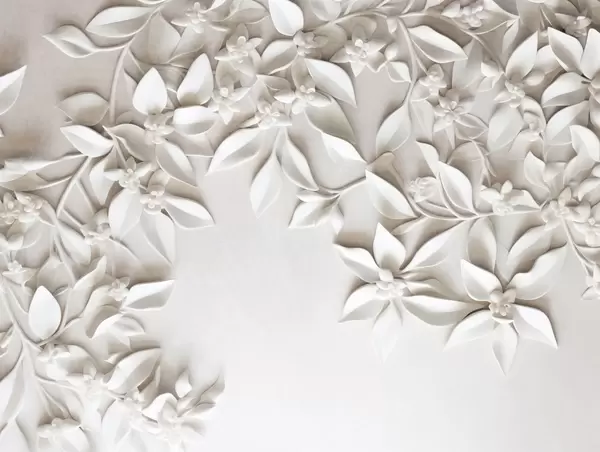 Fotobehang Witte bloemen en bladeren met textuur, bloemstuk, elegant ontwerp, minimalistische stijl, decoratieve kunst N° w09479
