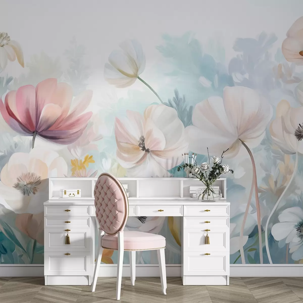 Fotobehang Een veld met pastelkleurige bloemen met delicate bloemblaadjes en zachtgroene bladeren, in een dromerige, gestructureerde aquarelstijl N° w09481