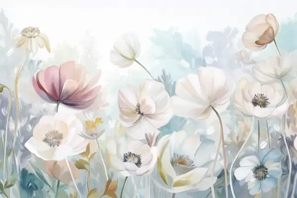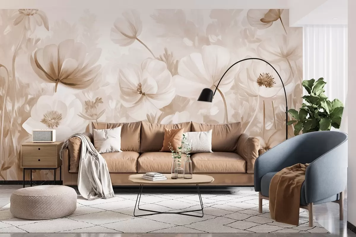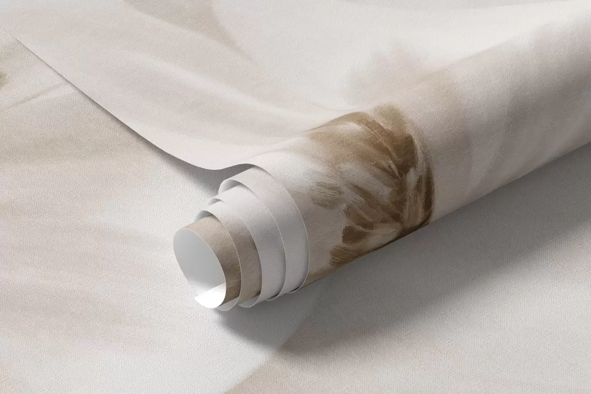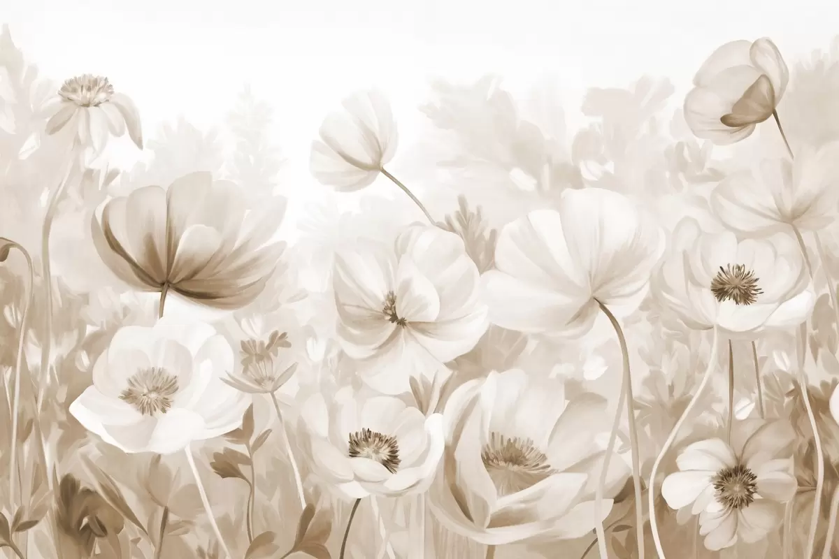 Fotobehang Een veld met beige bloemen met delicate bloemblaadjes, zachte bruine bladeren, in een dromerige, gestructureerde aquarelstijl N° w09481v1
