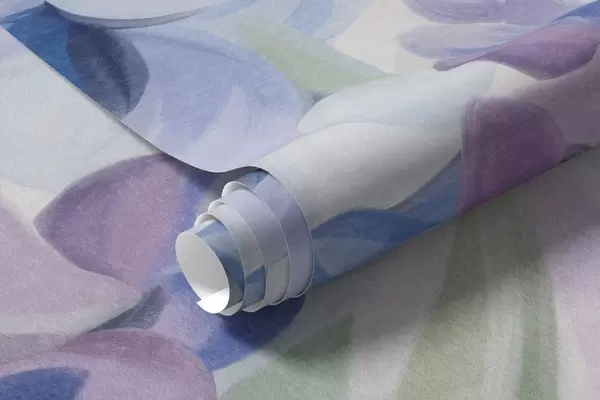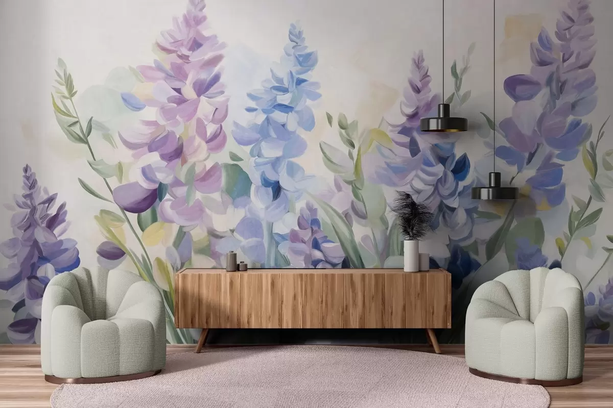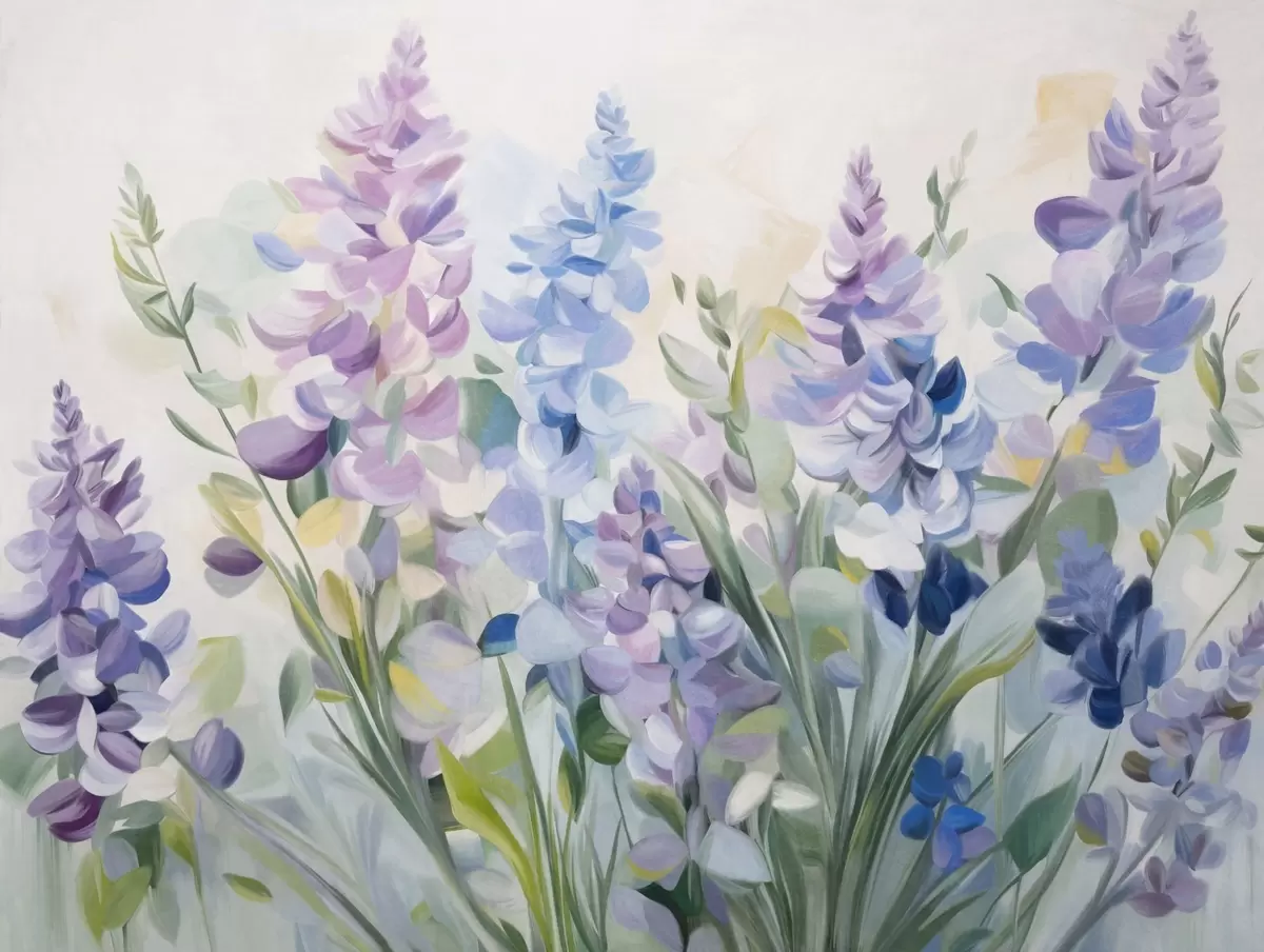 Fotobehang Paarse en blauwe bloemen met textuur en blauwe bladeren, lichte achtergrond, zachte penseelstreken, levendige kleuren N° w09482