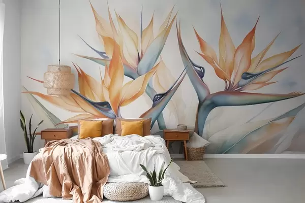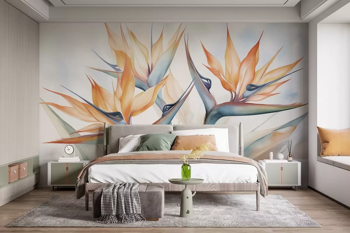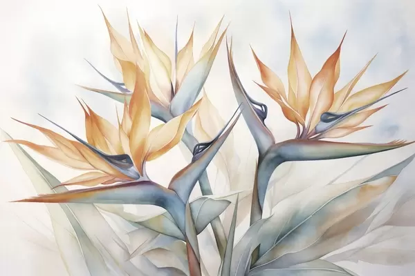 Fotobehang Paradijsvogelbloem, strelitzia met oranje bloemblaadjes, zachte aquareltextuur, lichte achtergrond N° w09483