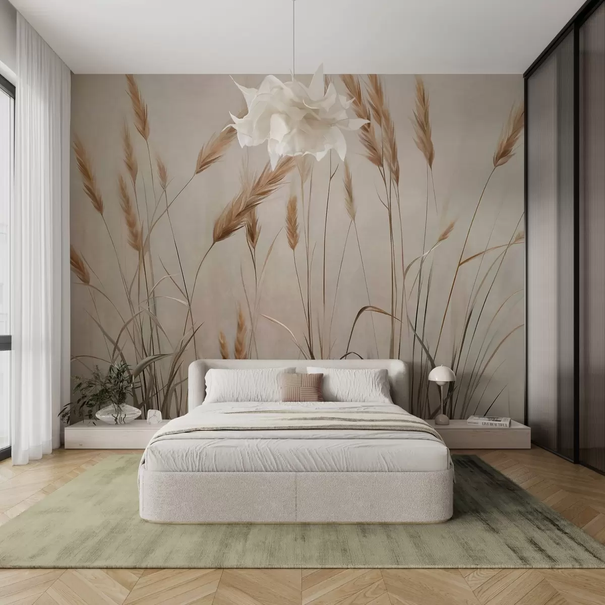 Fotobehang Tarweveld met gele korenaren, beige achtergrond, natuurlijke belichting, warme tinten, gedetailleerde penseelstreken N° w09493