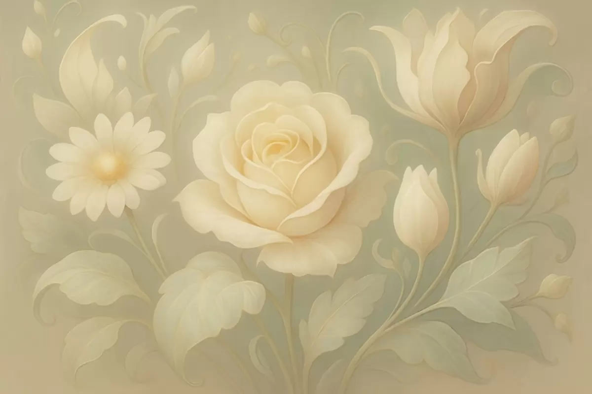 Fotobehang Delicate vintage compositie met beige rozen op een lichtgroene achtergrond N° w09499