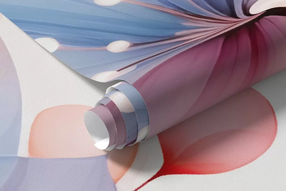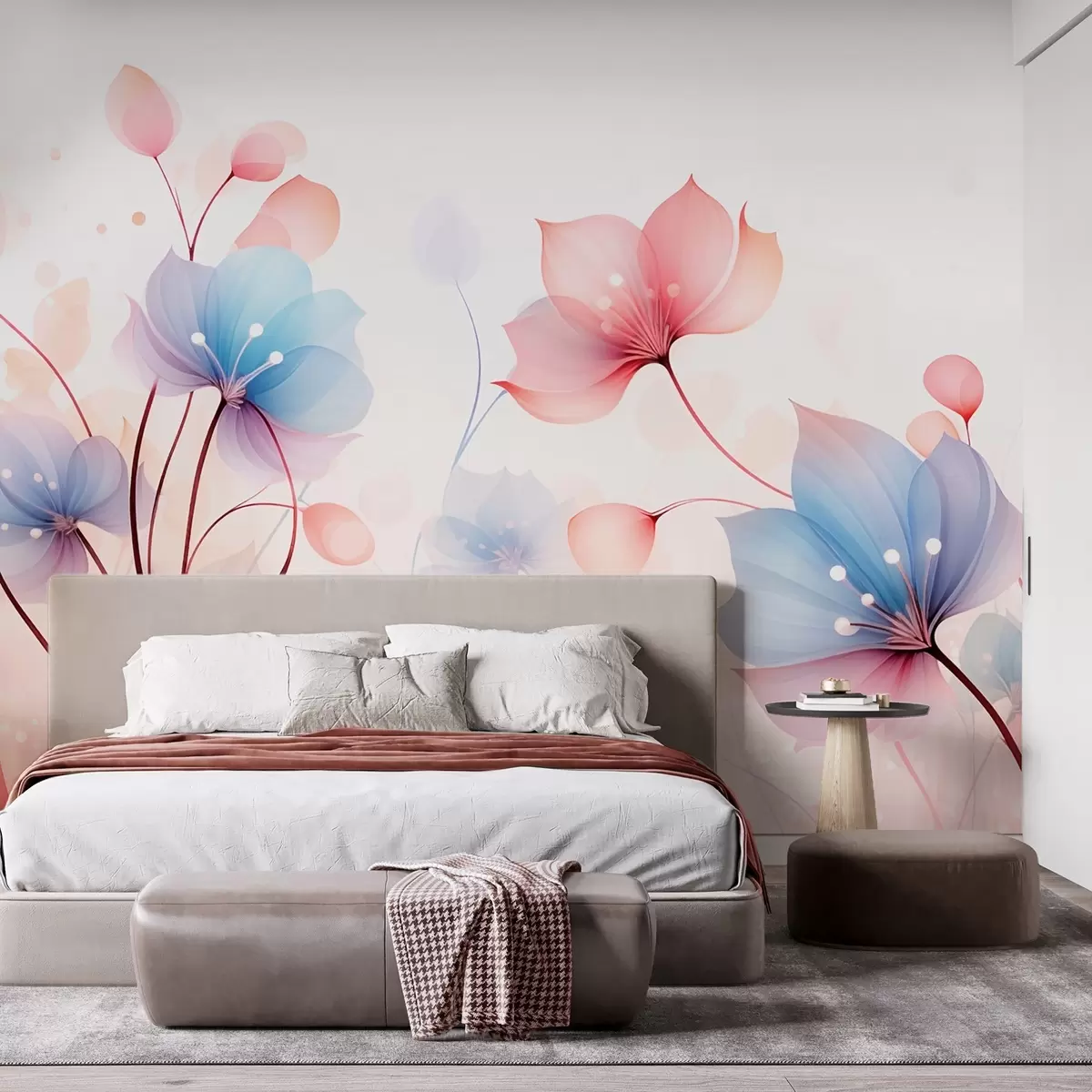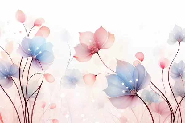 Fotobehang Delicate roze-blauwe bloemen — luchtige flora op een witte aquarelachtergrond N° w09507