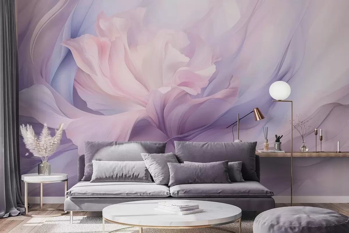 Fotobehang Zachte bloemblaadjesnevel: een luchtige bloem in een pastel-lila mist N° w09517