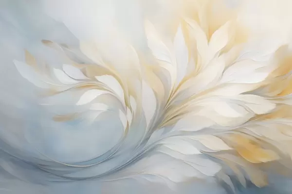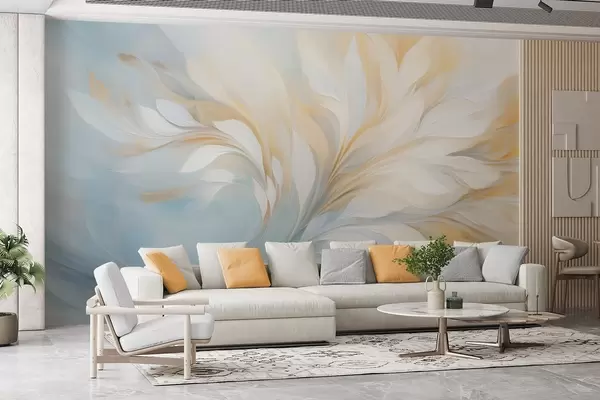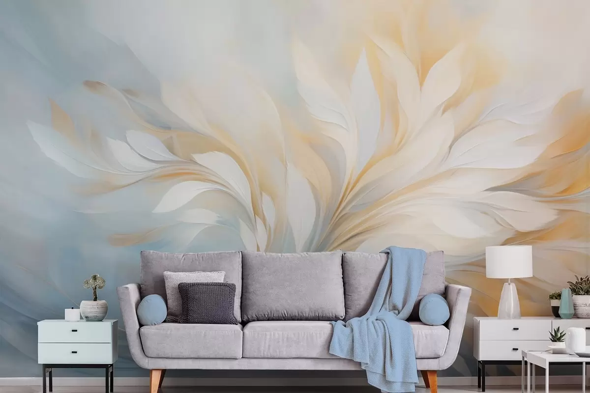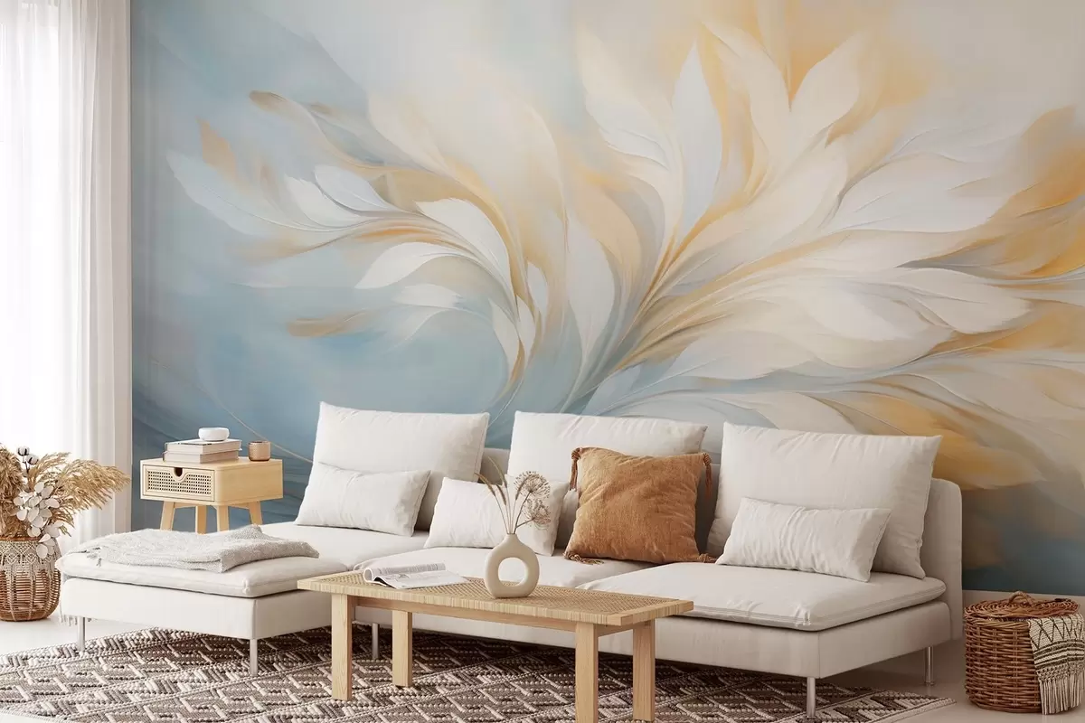 Fotobehang Abstracte compositie van vloeiende, veerachtige vormen in gele en blauwe tinten N° w09525