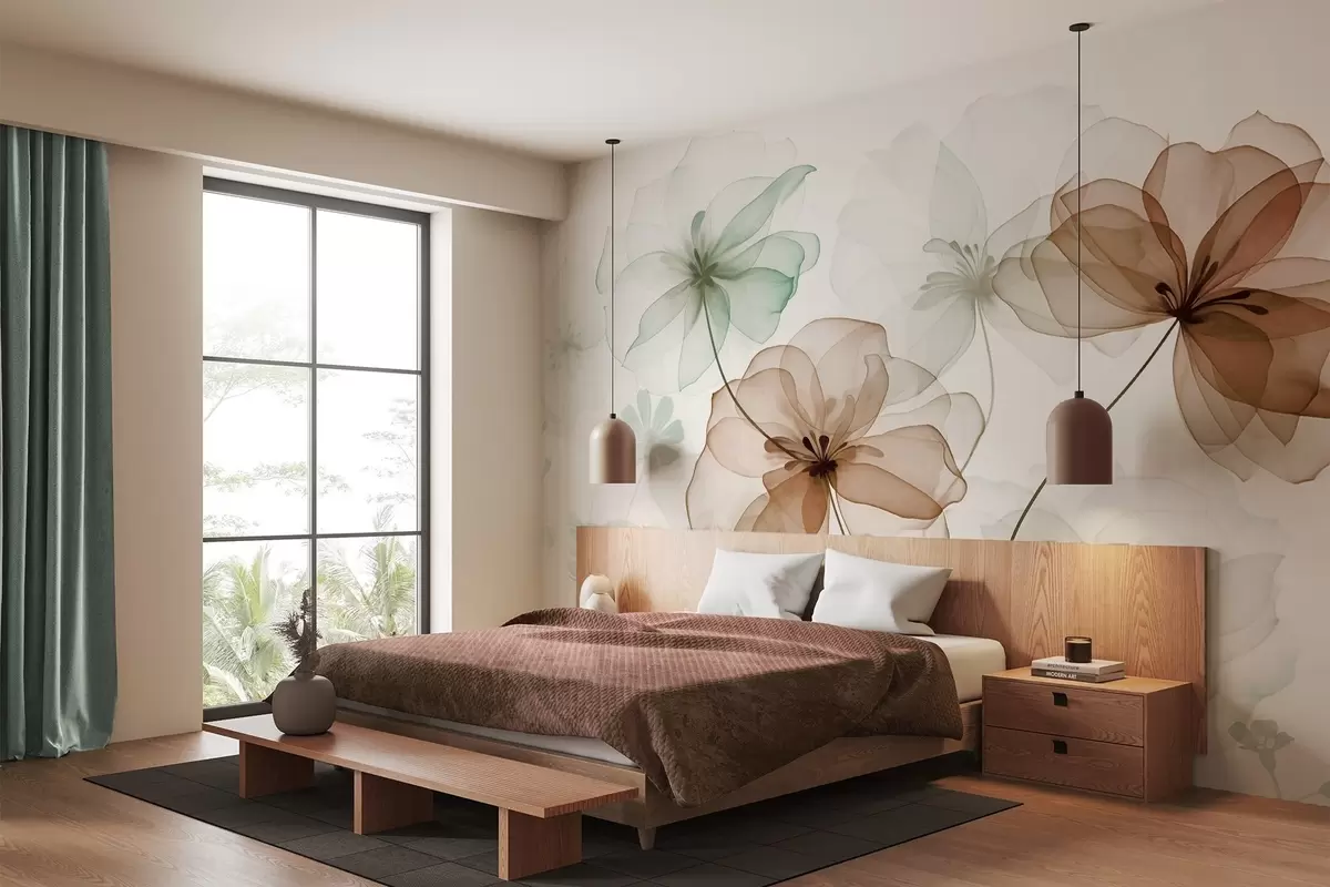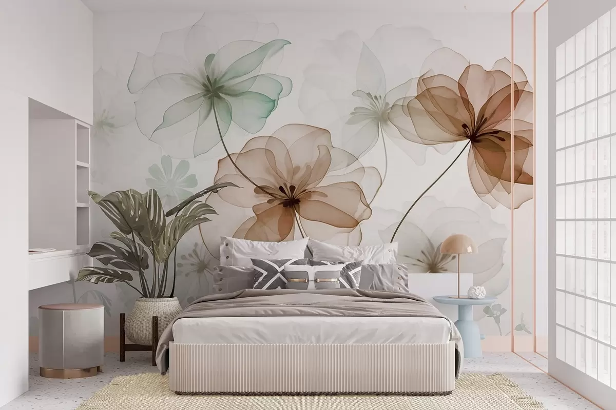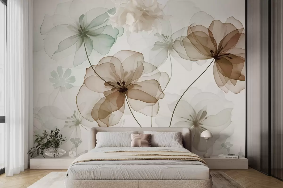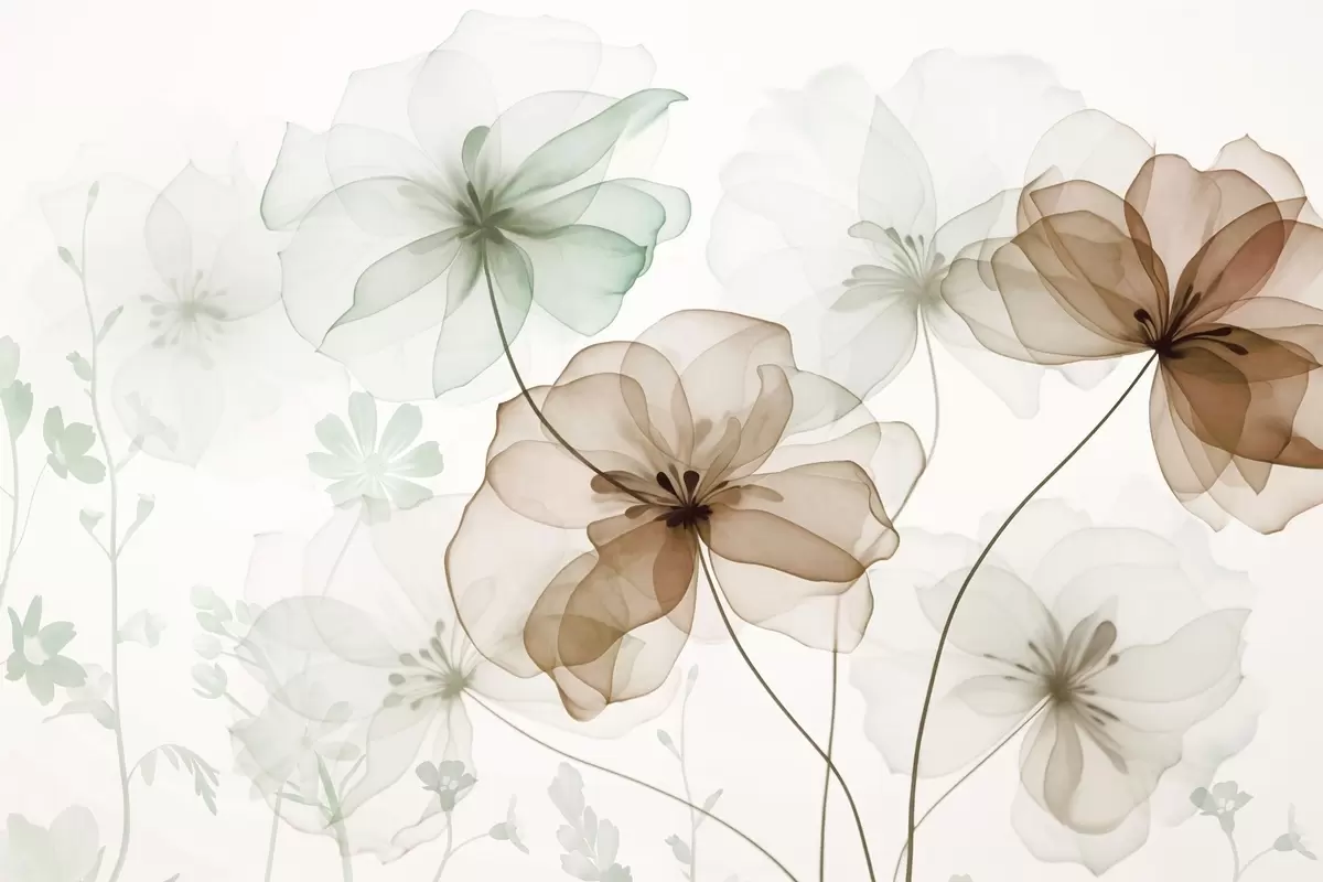 Fotobehang Doorschijnende bloemen met bruine en groene bloemblaadjes, lange stelen, lichte achtergrond, zachte kleuren, bloemmotief met textuur N° w09529