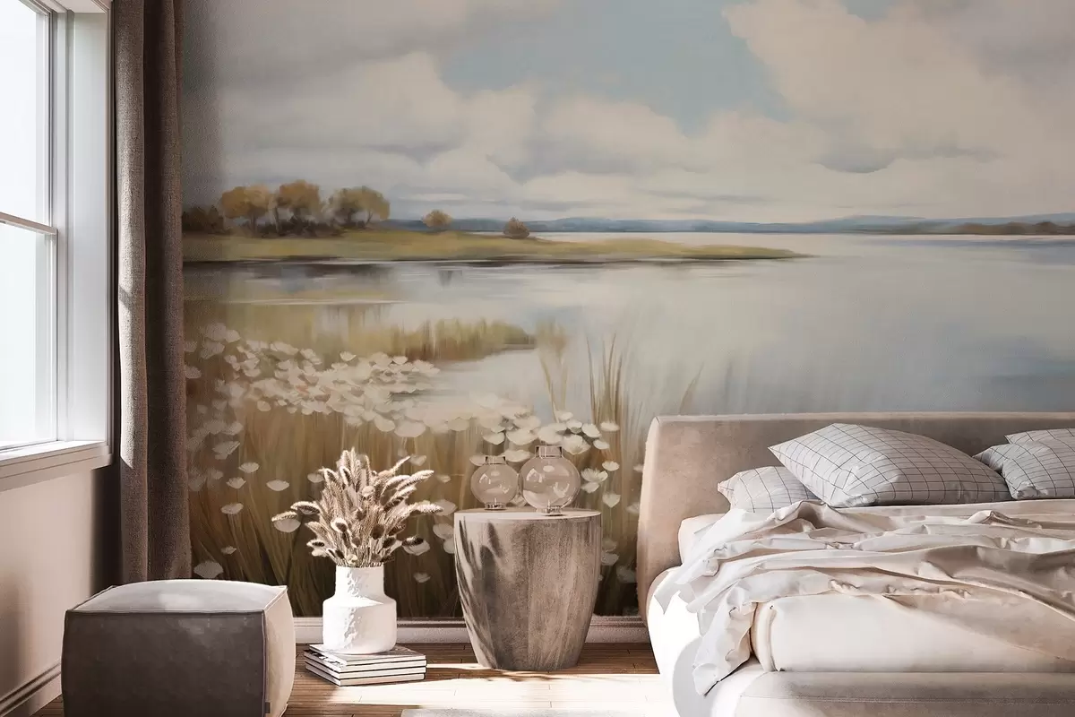 Fotobehang Getextureerd landschap, veld met witte bloemen en hoog gras, een meer op de achtergrond, een met gras begroeide heuvel met bomen, zachte kleuren N° w09530