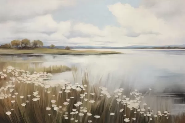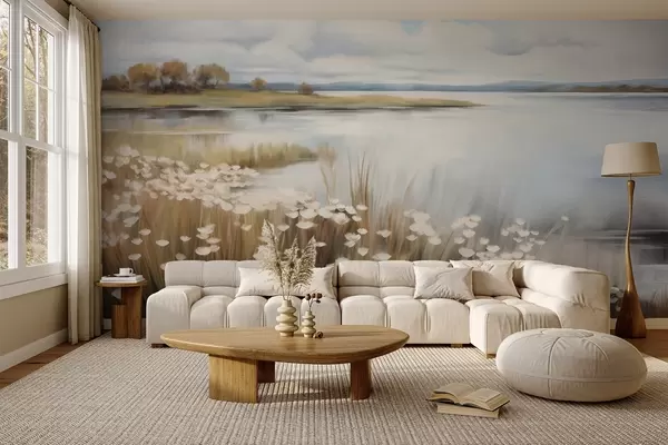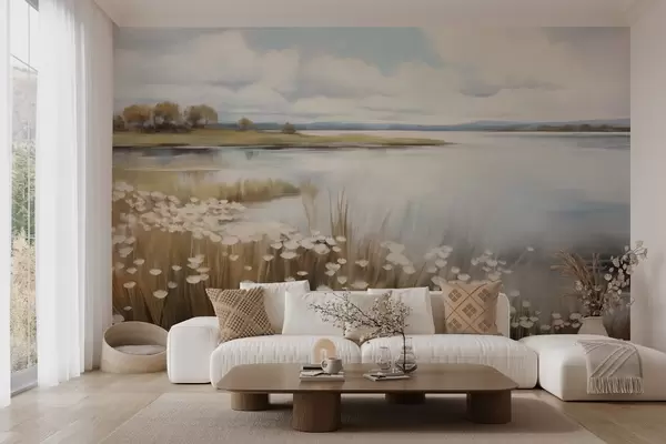 Fotobehang Getextureerd landschap, veld met witte bloemen en hoog gras, een meer op de achtergrond, een met gras begroeide heuvel met bomen, zachte kleuren N° w09530