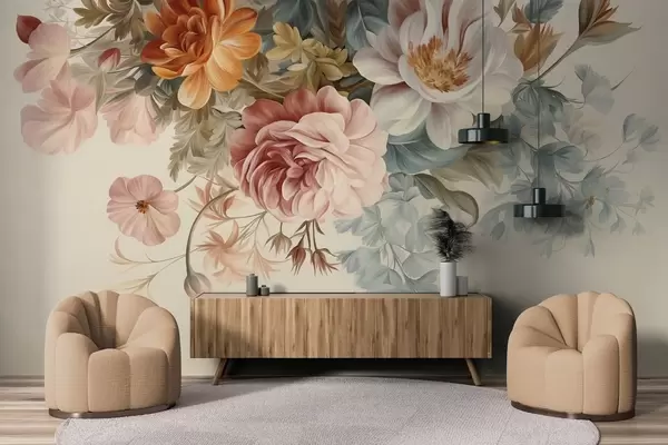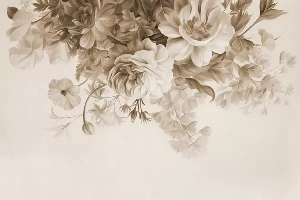 Fotobehang Vintage bloemstuk met rozen, pioenrozen en andere bloemen met textuur en bladeren, op een lichte achtergrond N° w09532