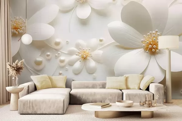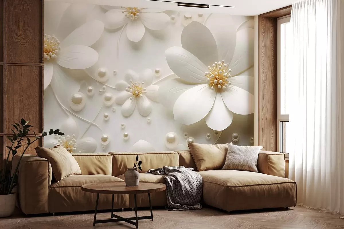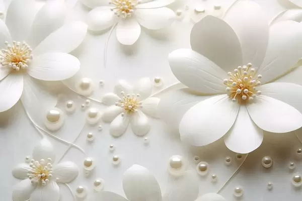 Fotobehang Witte bloemen met parels verspreid over een witte achtergrond, elegant en minimalistisch ontwerp, met textuur N° w09535