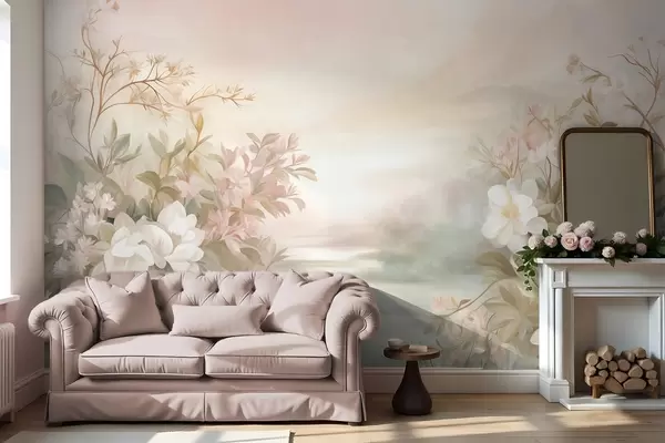 Fotobehang Een landschap met een rivier omringd door bloemen en planten, zachte kleuren, roze lucht, aquarelachtige textuurstijl N° w09537