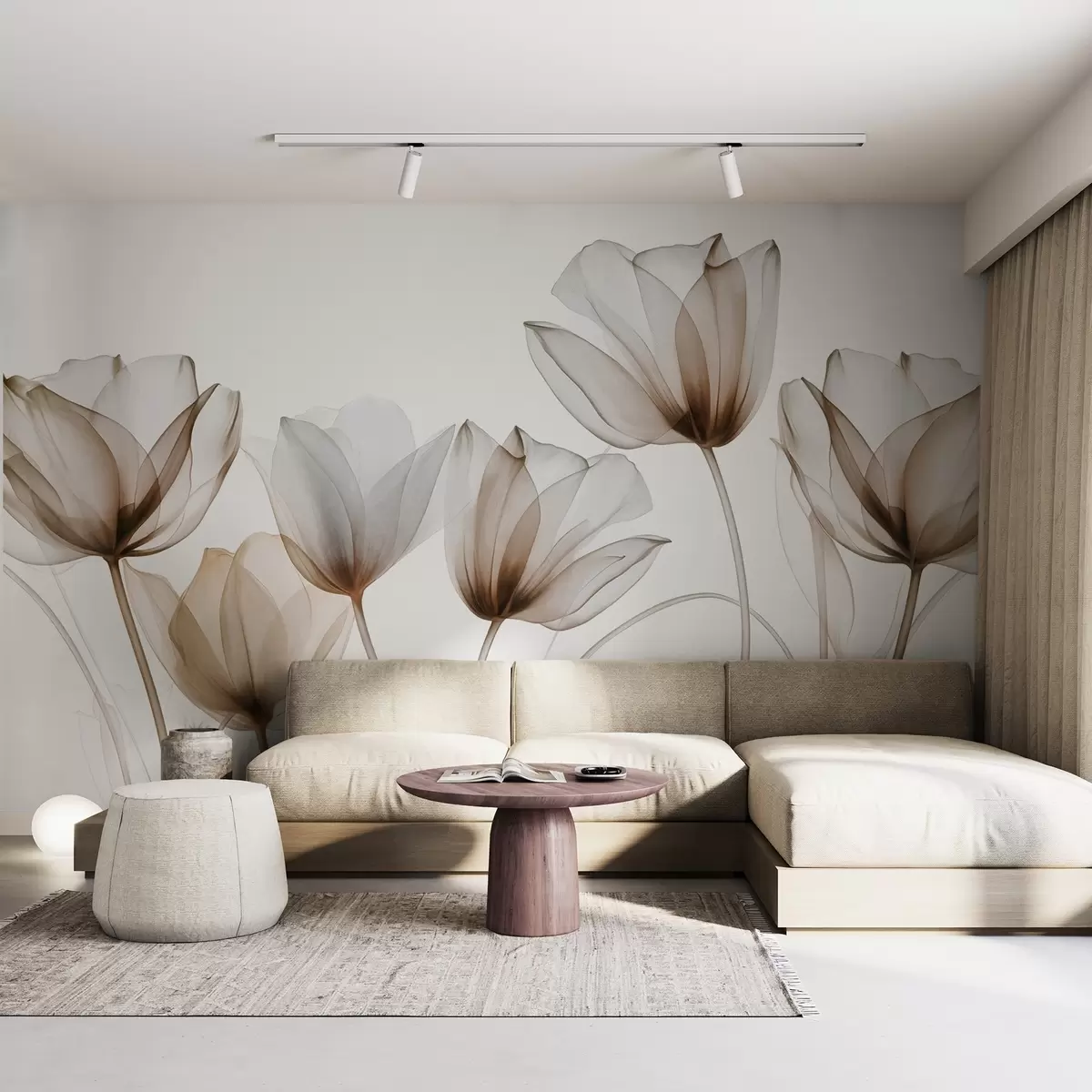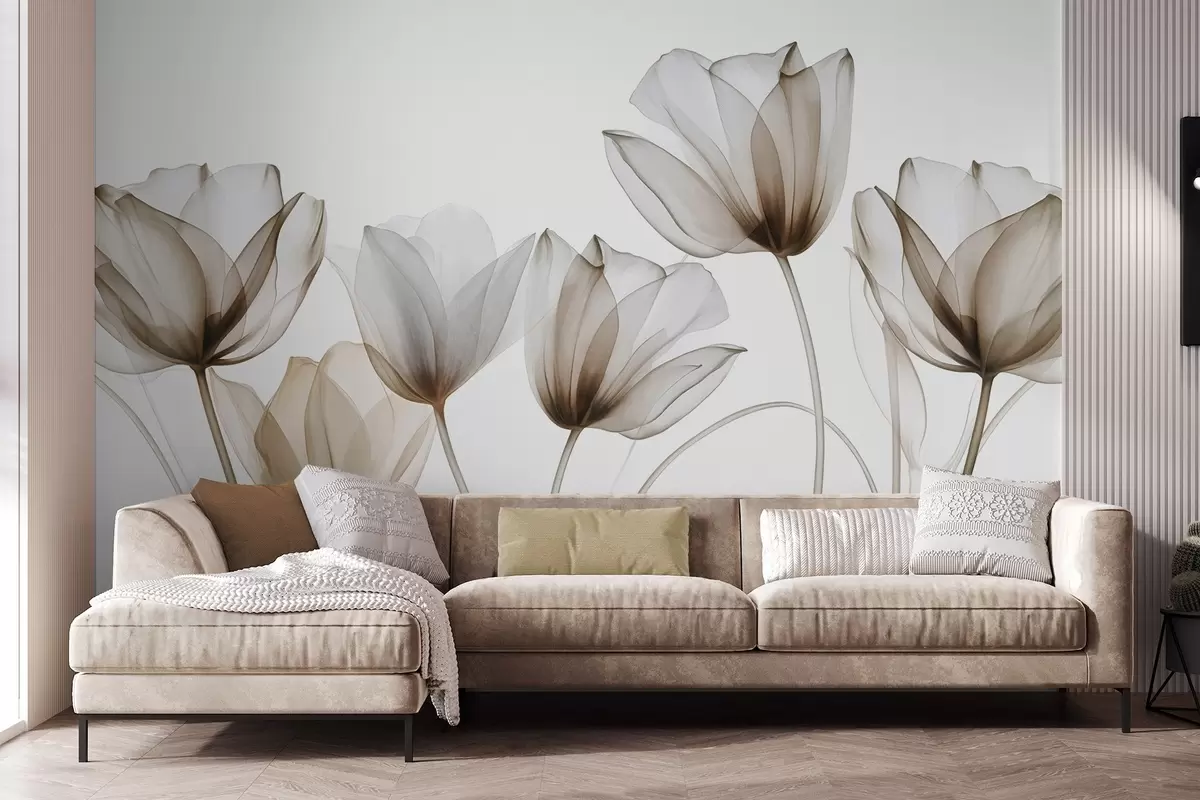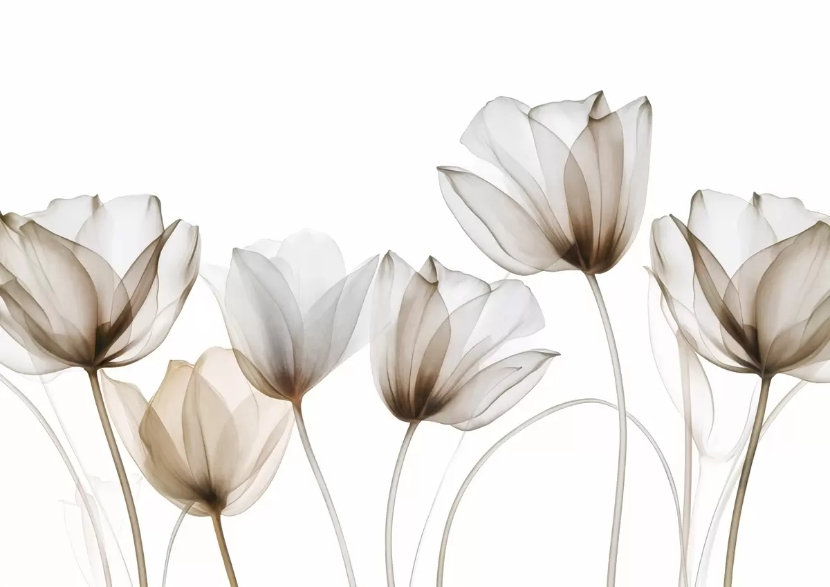 Fotobehang Doorschijnende bruine en witte tulpenbloemen met lange stelen, tegen een lichte achtergrond, delicate en gestructureerde bloemenkunst N° w09538v1