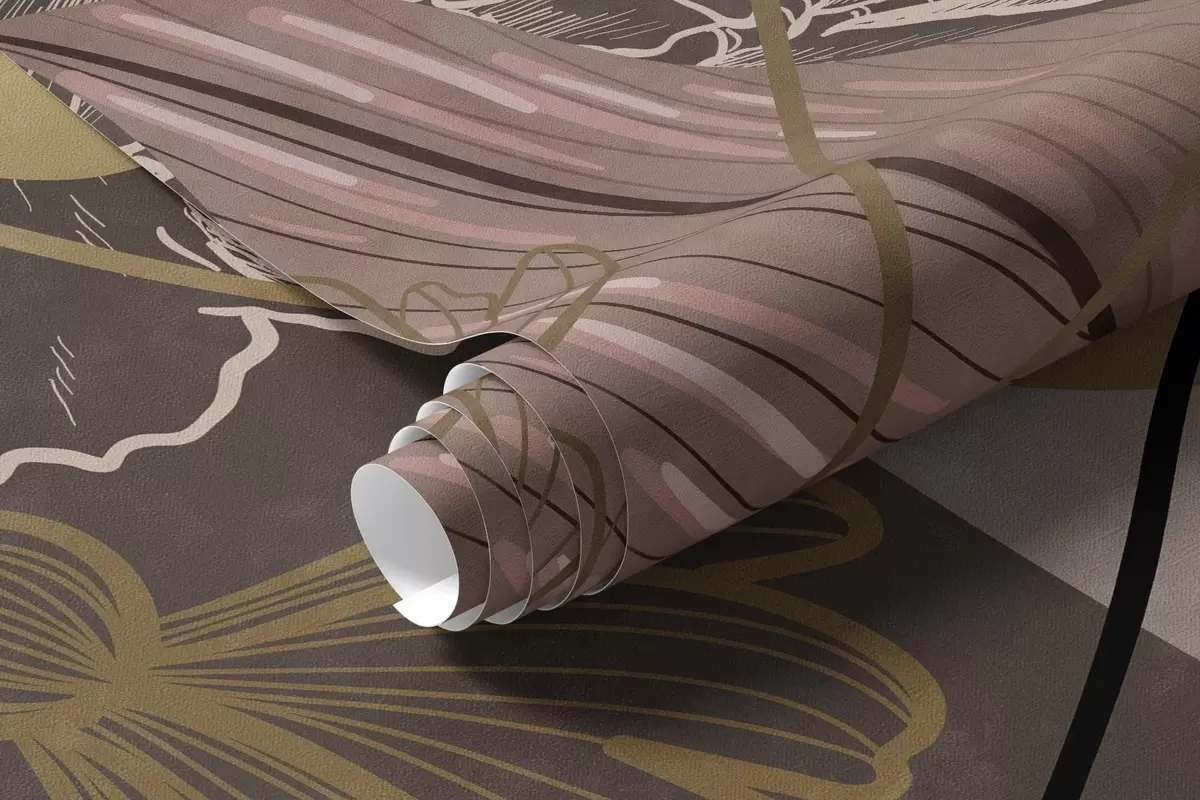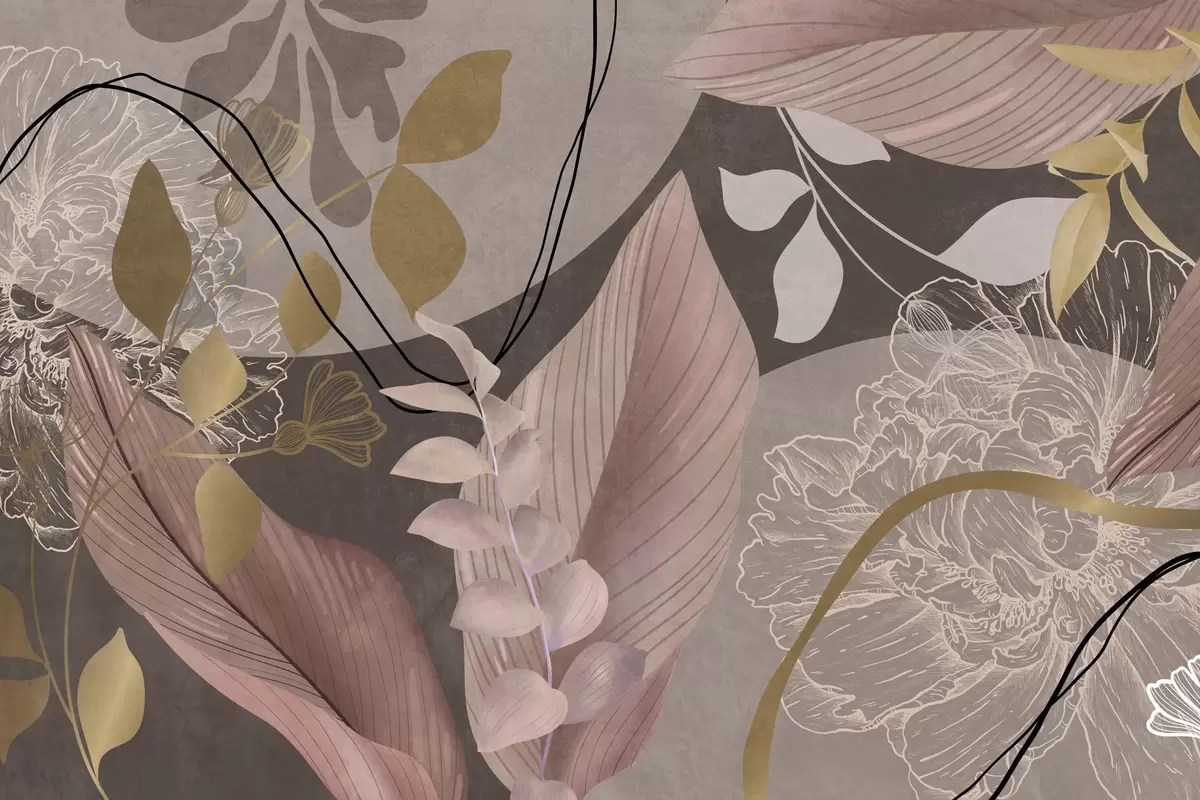 Fotobehang Abstracte bloemenprint met grote bladeren in gedempte roze en bruine tinten met dunne zwarte lijnen en witte bloemcontouren. N° w09544