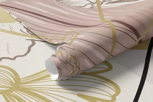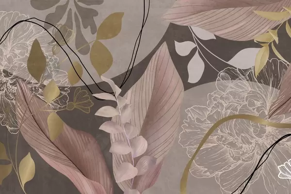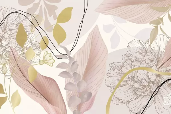 Fotobehang Abstracte bloemenprint met grote bladeren in gedempte roze en gele tinten met dunne zwarte lijnen en witte bloemcontouren. N° w09544v1