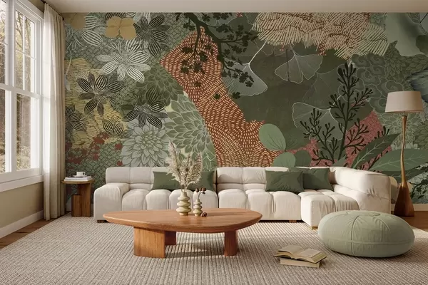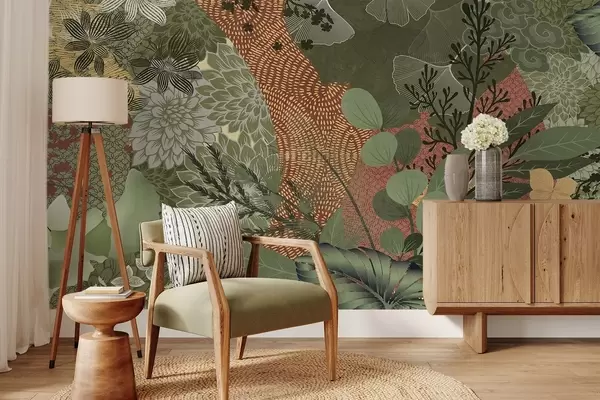 Fotobehang Abstracte collage met textuur van botanische elementen met bladeren, bloemen en organische texturen, in tinten groen en bruin. N° w09545