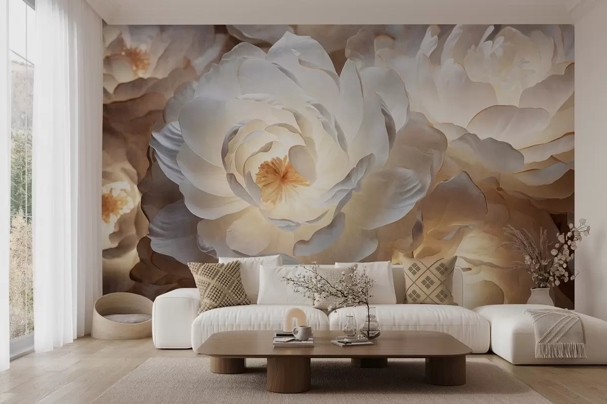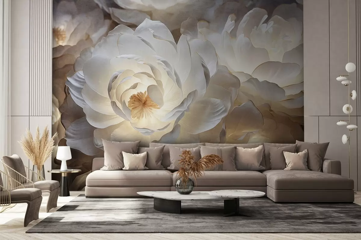 Fotobehang Grote, witte fantasie-pioenrozen met gele hartjes, zachte verlichting en delicate, gelaagde bloemblaadjes met textuur. N° w09550