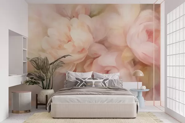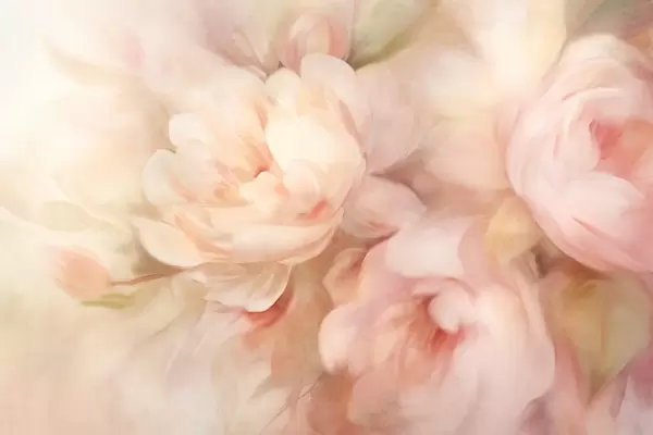 Fotobehang Wazige lichtroze en crèmekleurige pioenrozen met zachte, schilderachtige penseelstreken, waardoor een bloemstuk met textuur ontstaat. N° w09556