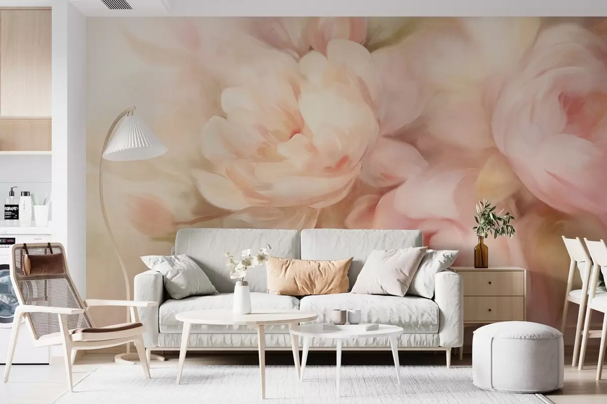 Fotobehang Wazige lichtroze en crèmekleurige pioenrozen met zachte, schilderachtige penseelstreken, waardoor een bloemstuk met textuur ontstaat. N° w09556