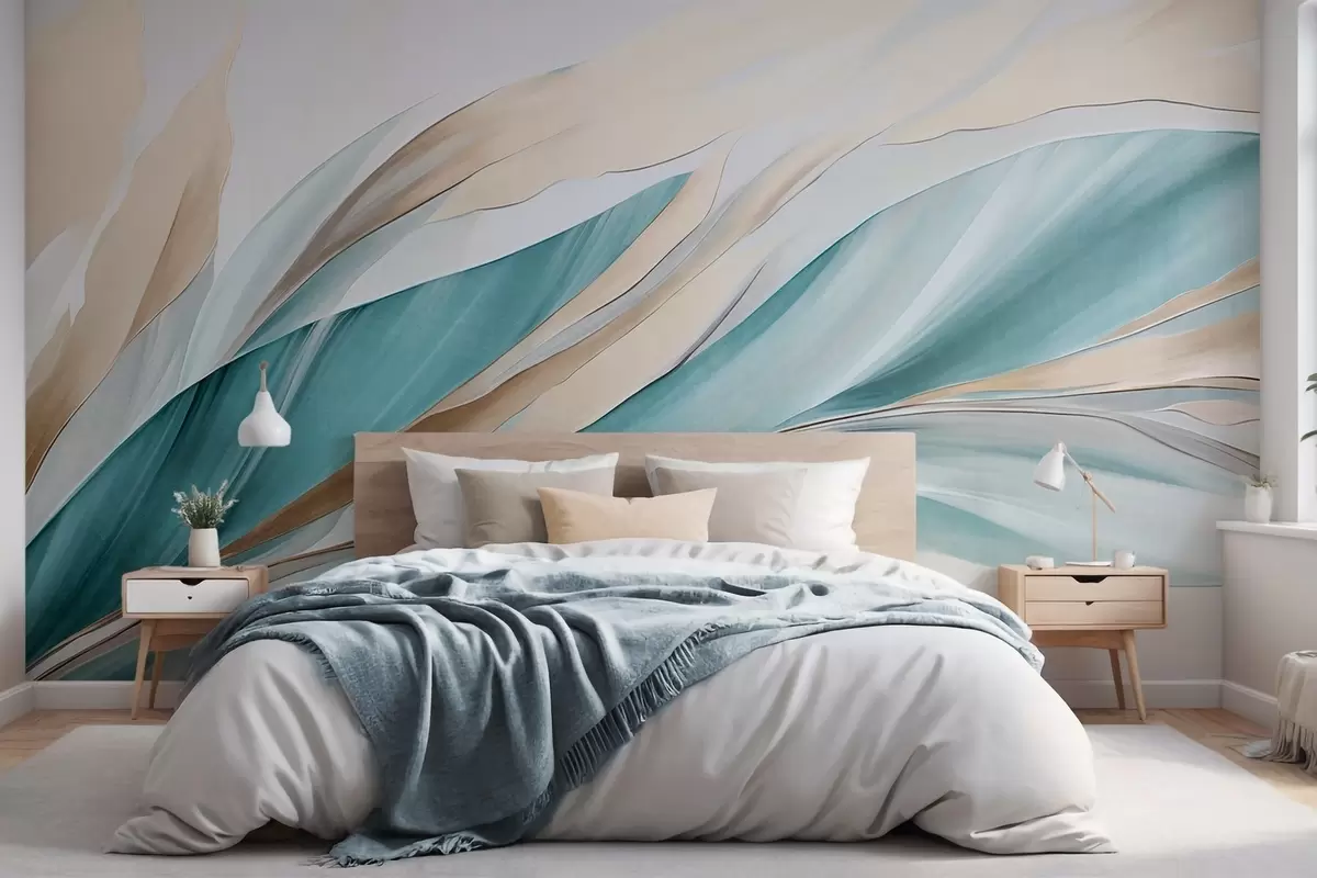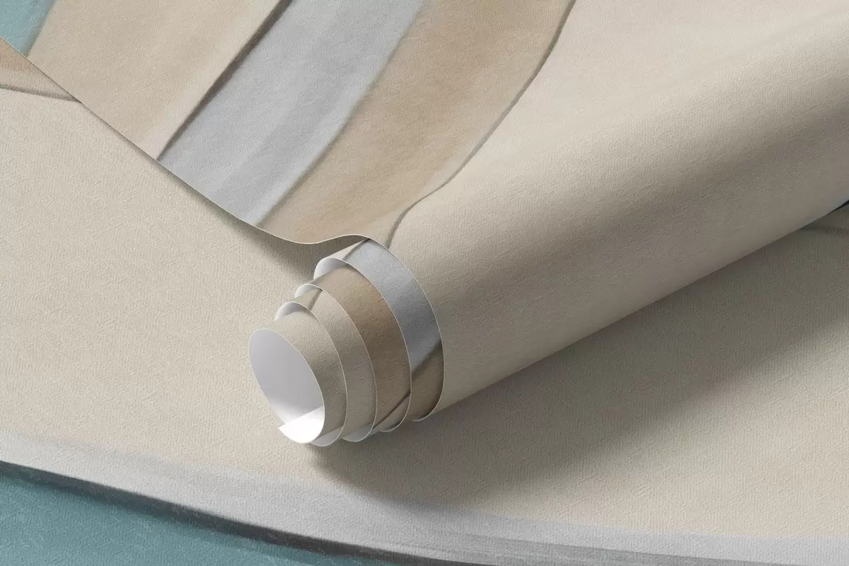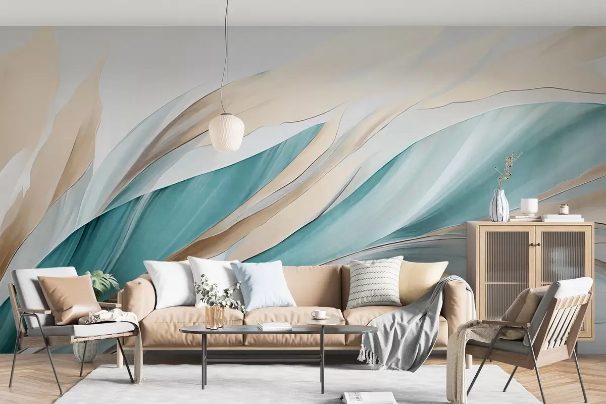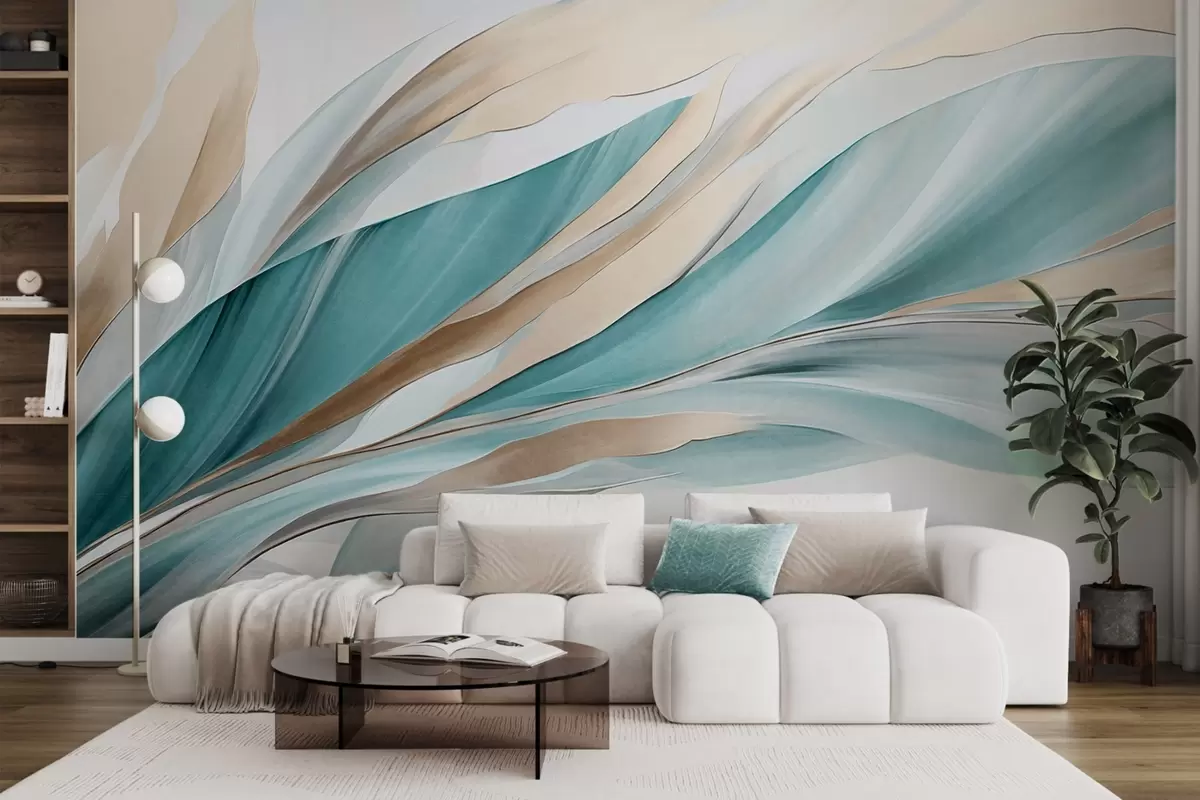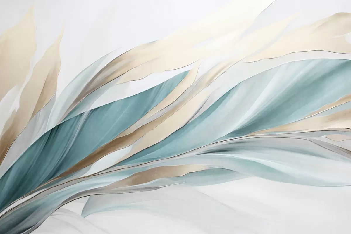 Fotobehang Abstracte golvende golven van blauwgroen en geel, met dunne vormen en lijnen, tegen een witte achtergrond, kunst met textuur N° w09585