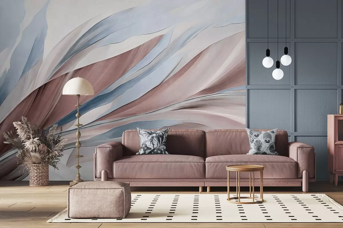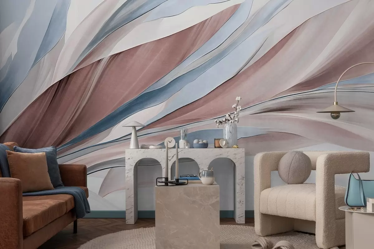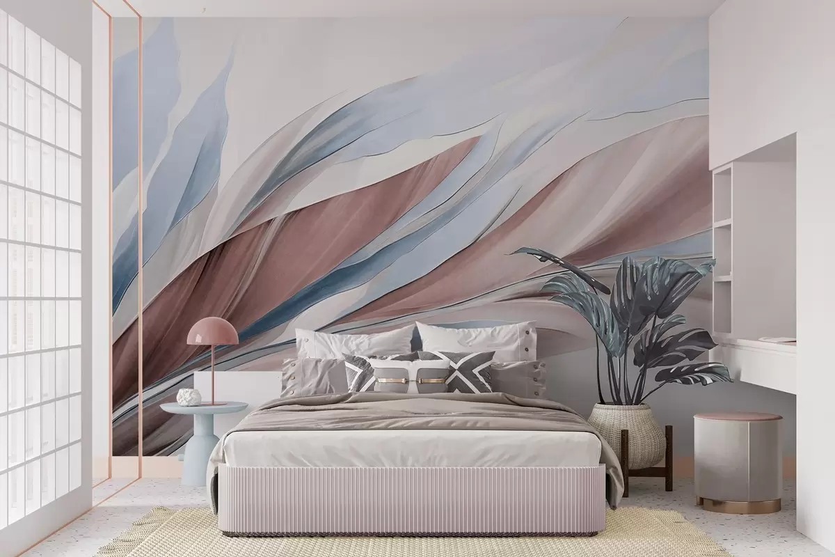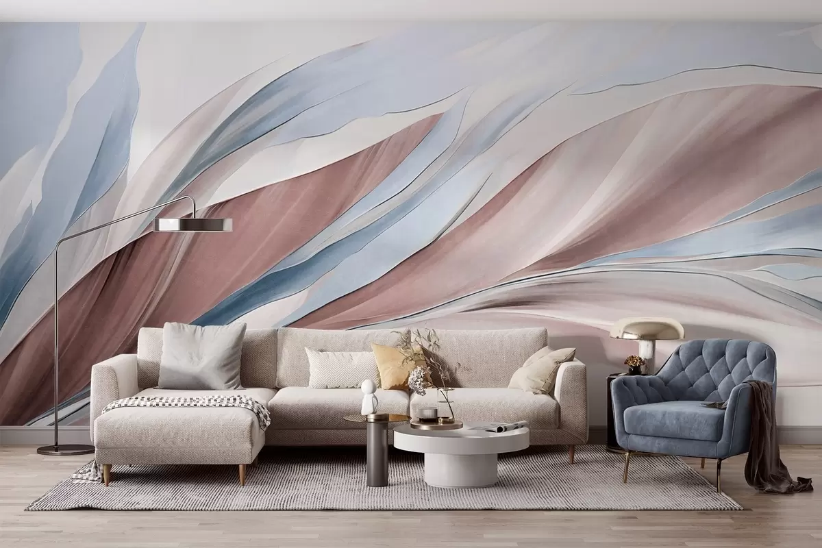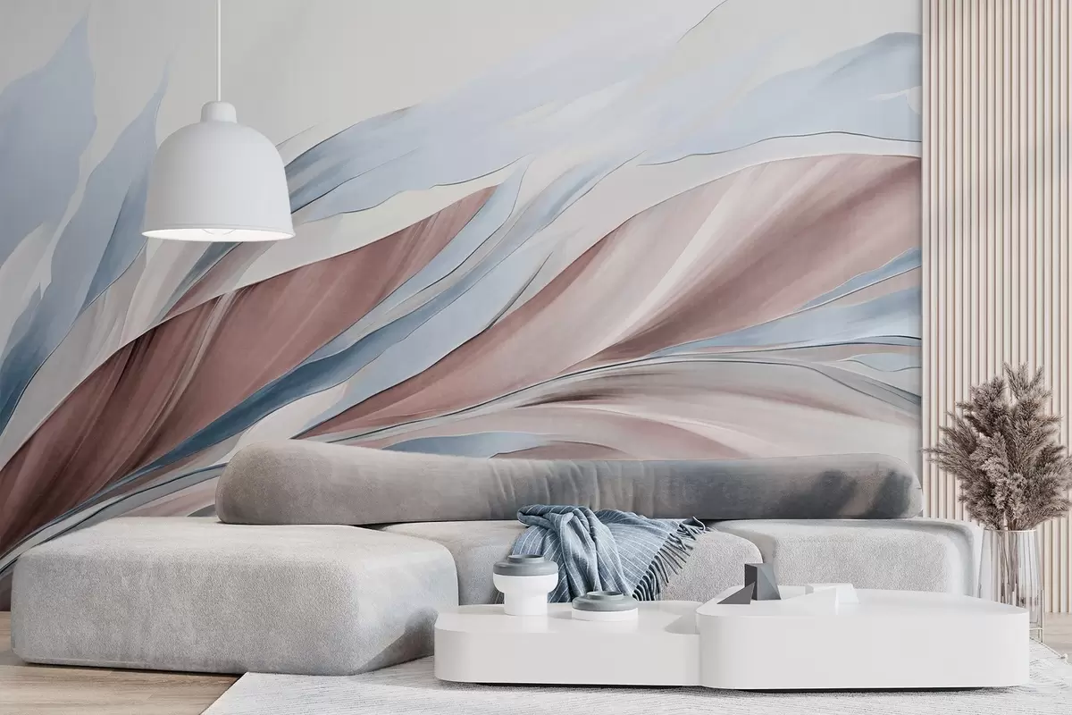 Fotobehang Abstracte golvende golven van blauw en bruin, met dunne vormen en lijnen, tegen een witte achtergrond, kunst met textuur N° w09585v1