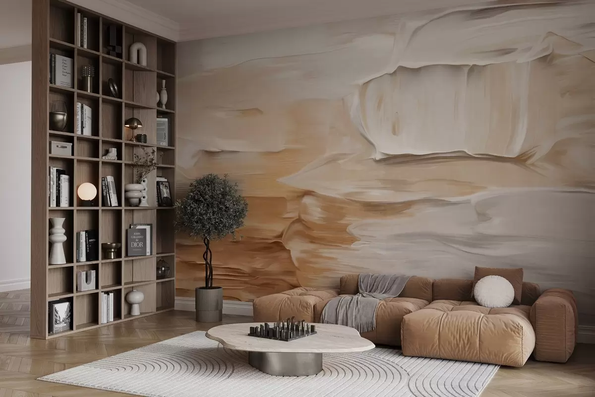 Fotobehang Abstracte imitatie van getextureerde penseelstreken in warme aardetinten van beige, crème en bruin, moderne kunst N° w09588