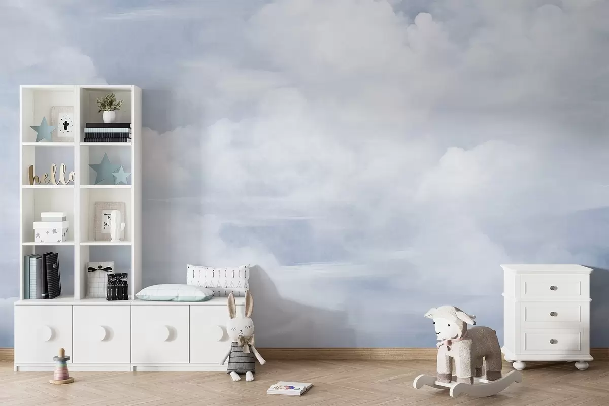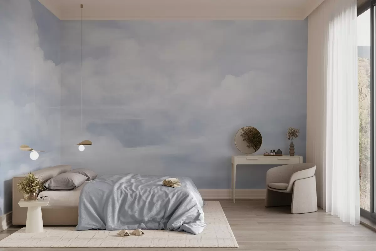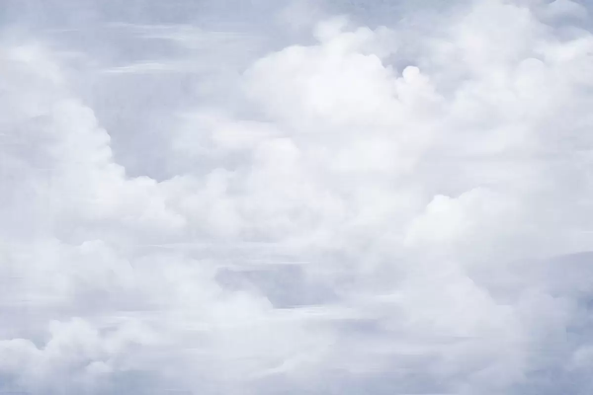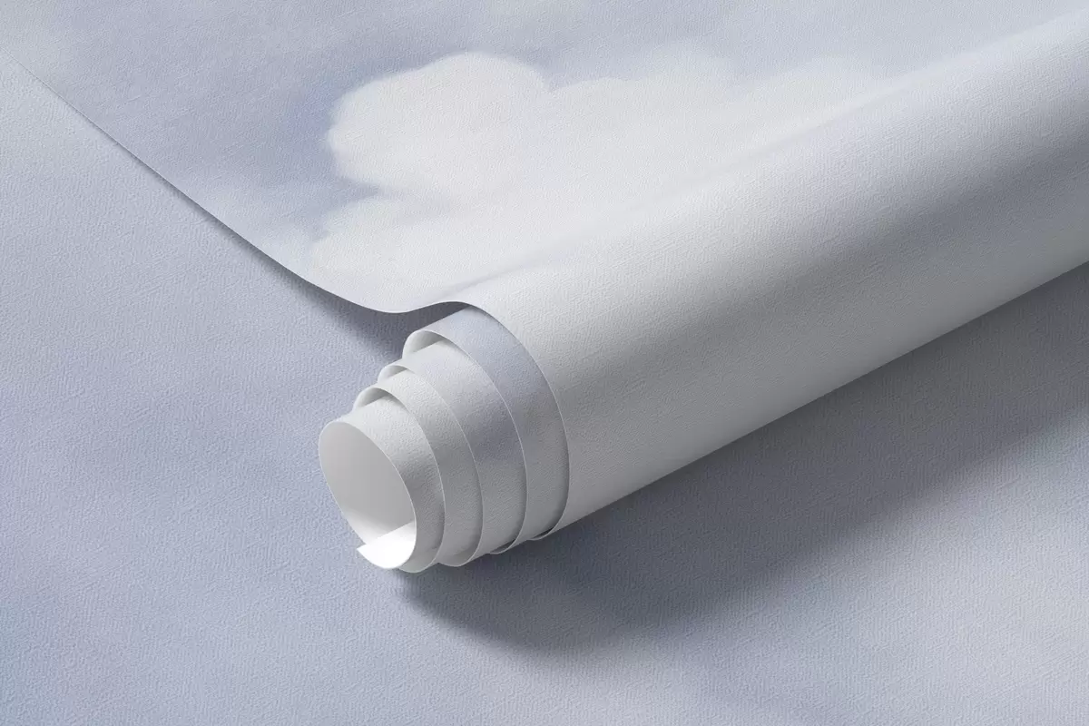 Fotobehang Pastelkleurige lucht met witte wolken en een zachte, minimalistische esthetiek N° w09589