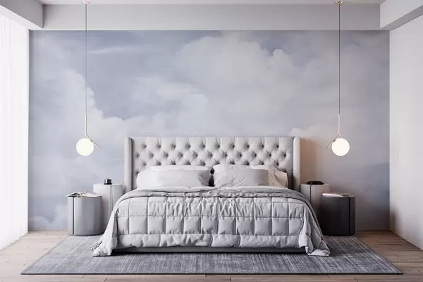 Fotobehang Pastelkleurige lucht met witte wolken en een zachte, minimalistische esthetiek N° w09589