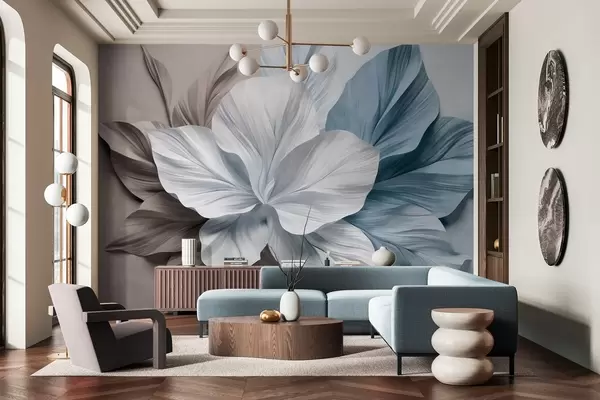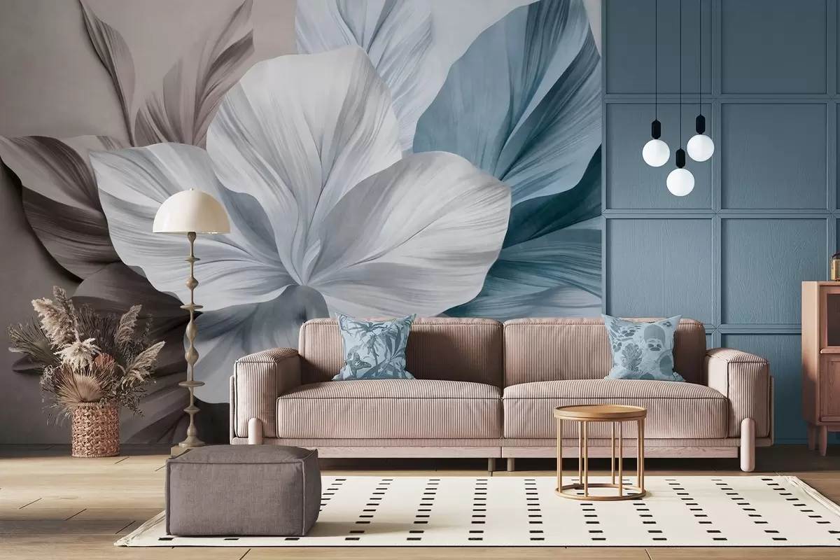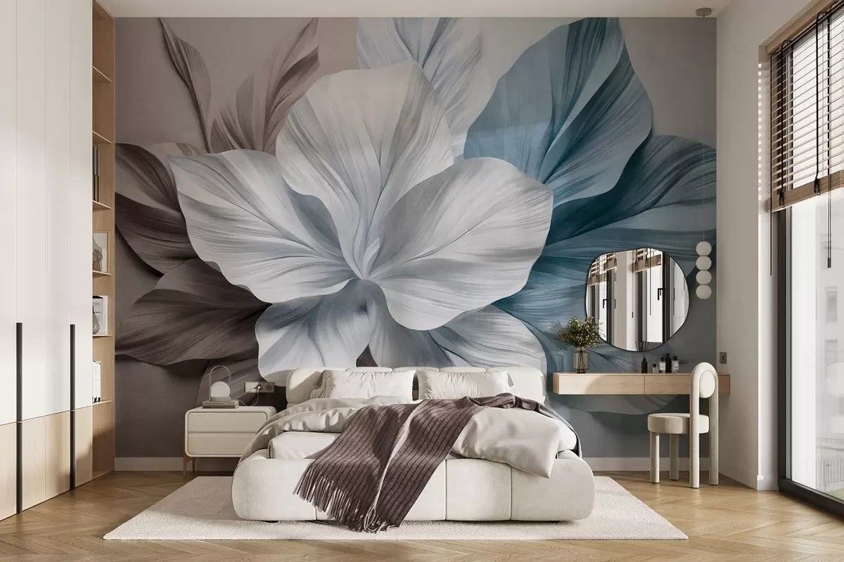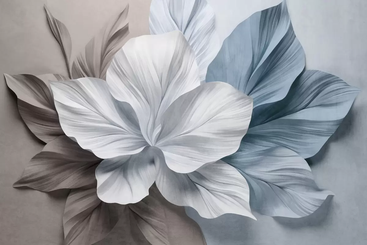 Fotobehang Abstracte bloem met meerdere bloemblaadjes en gestructureerde bladeren in bruine en blauwe tinten, zachte achtergrond N° w09604v1