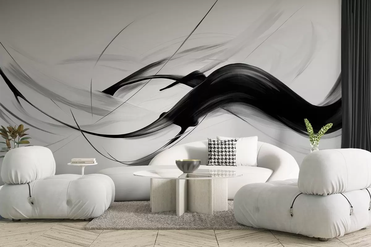 Fotobehang Abstracte zwart-witte penseelstreken met dunne lijnen die een modern ontwerp vormen tegen een lichte achtergrond. N° w09605