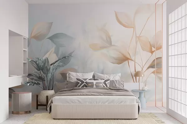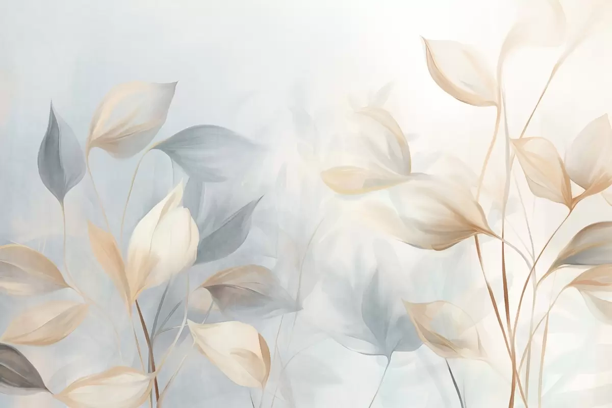 Fotobehang Zachte, delicate, doorschijnende bladeren in gedempte tinten beige, perzik en lichtblauw, gestructureerde pastelkunst N° w09607