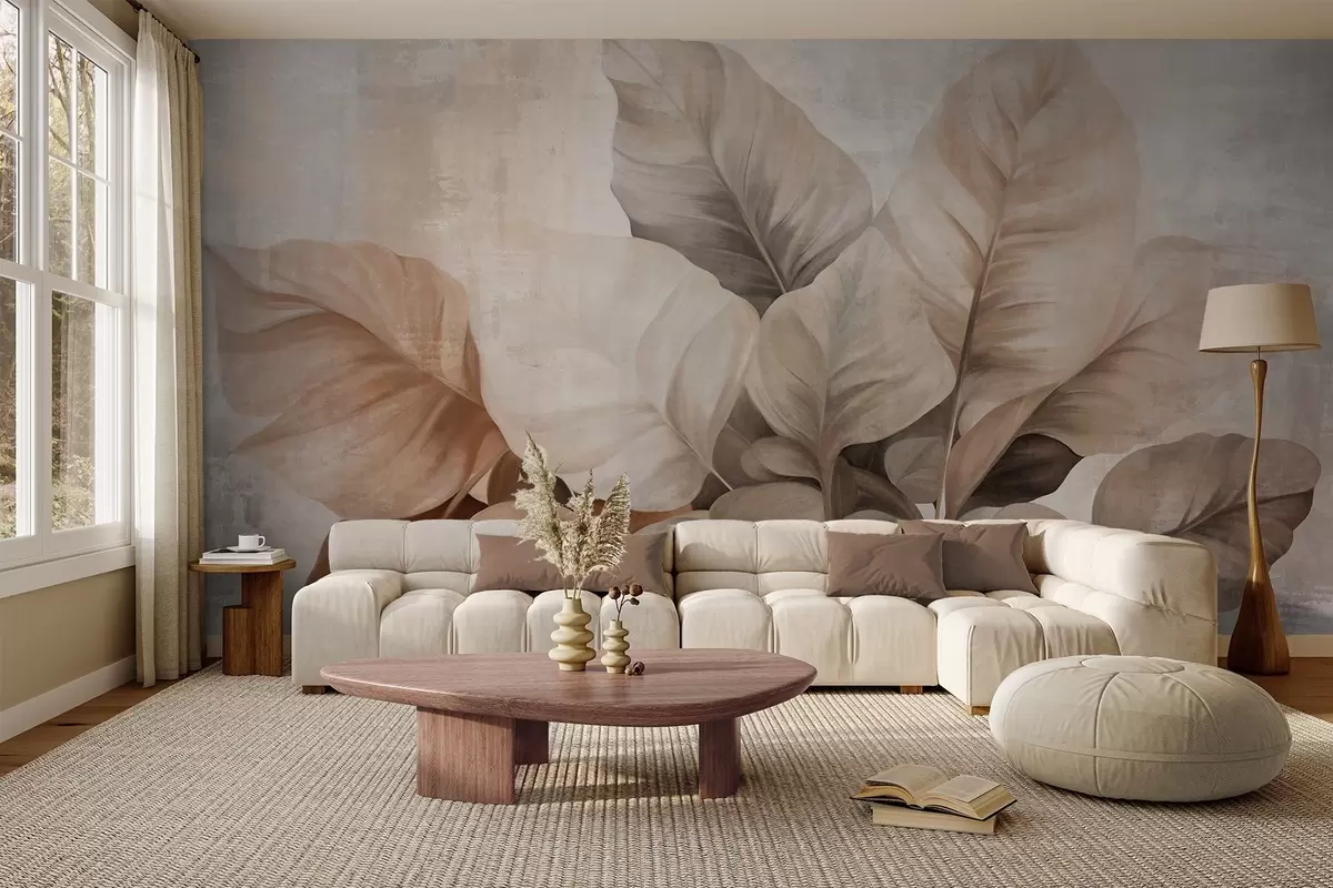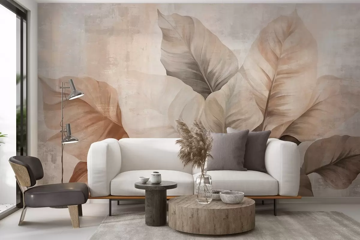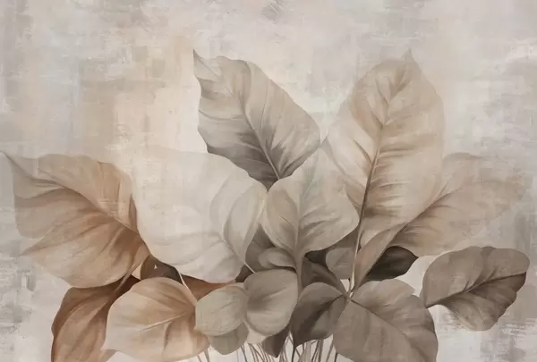 Fotobehang Textuurverf imitatie van grote, lichtbruine bladeren tegen een neutrale achtergrond met subtiele penseelstreken N° w09614
