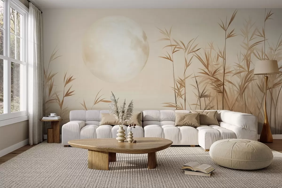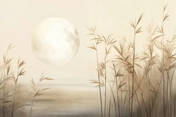 Fotobehang Getextureerd landschap met hoog riet, een meer en een bleke maan aan een nevelige hemel N° w09631