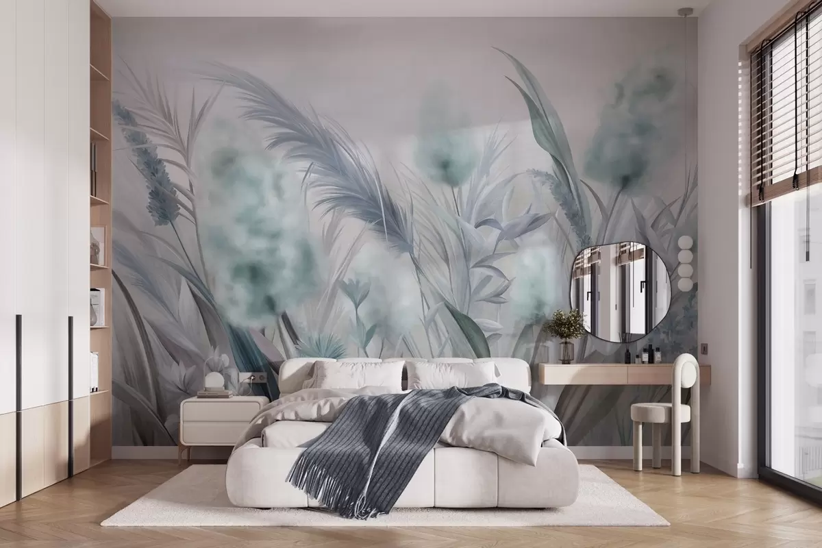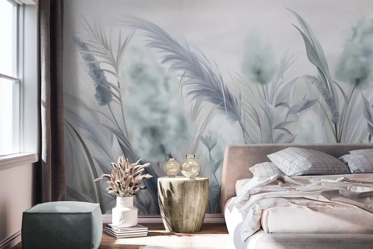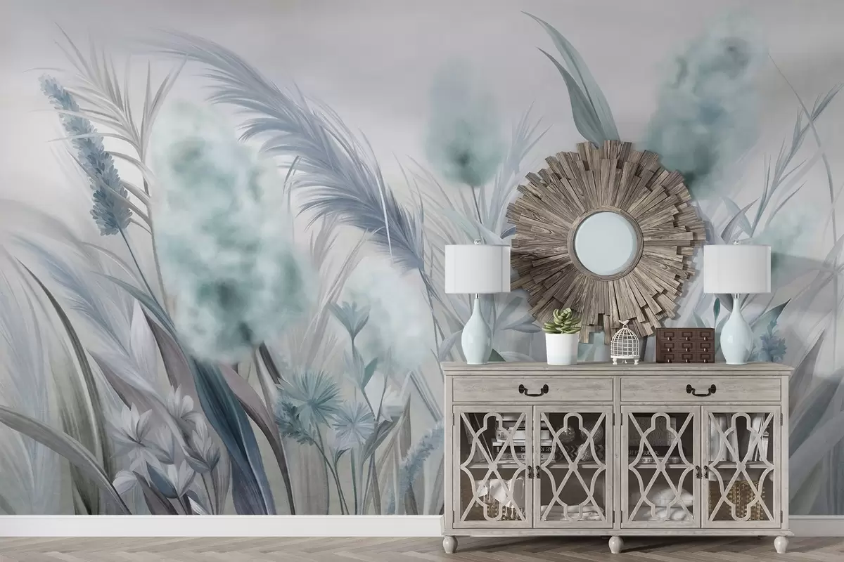 Fotobehang Blauw en grijs pampagras en andere gedroogde bloemen met een zachte, nevelige lucht op de achtergrond N° w09635v1
