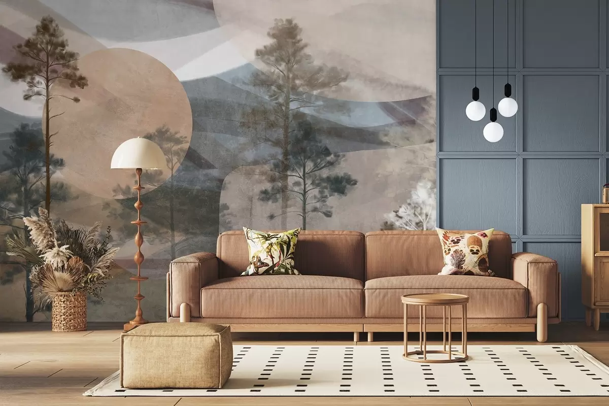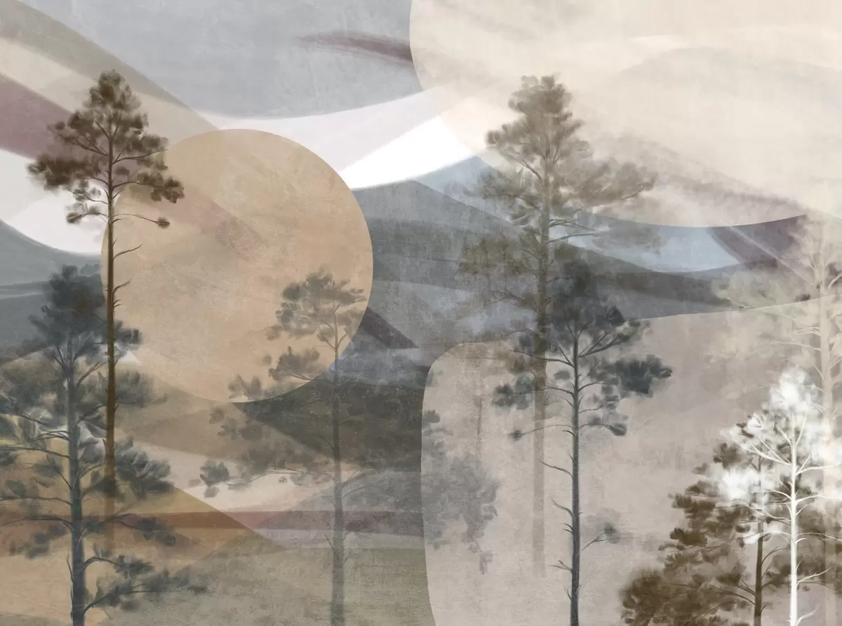 Fotobehang Hoge dennenbomen in een gedempt landschap met textuur, abstracte cirkelvormige vormen en gelaagde bergen in aardetinten. N° w09636