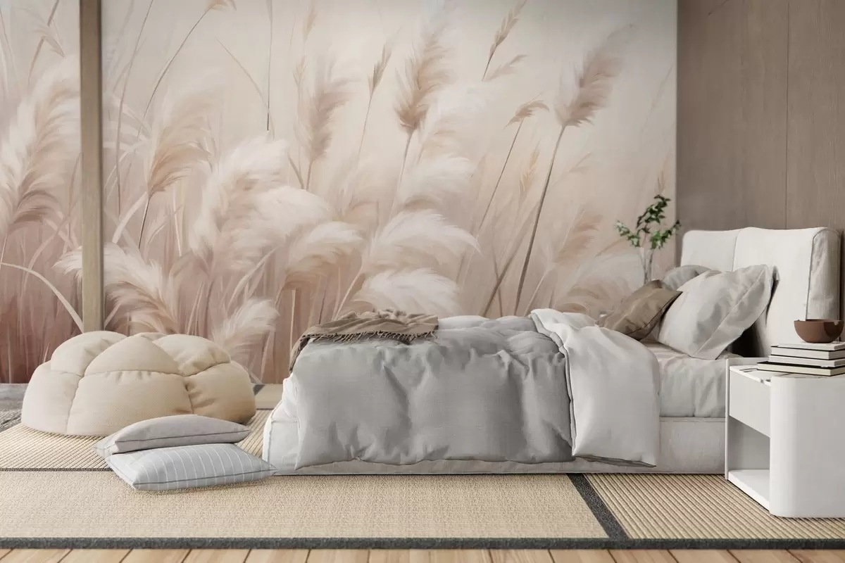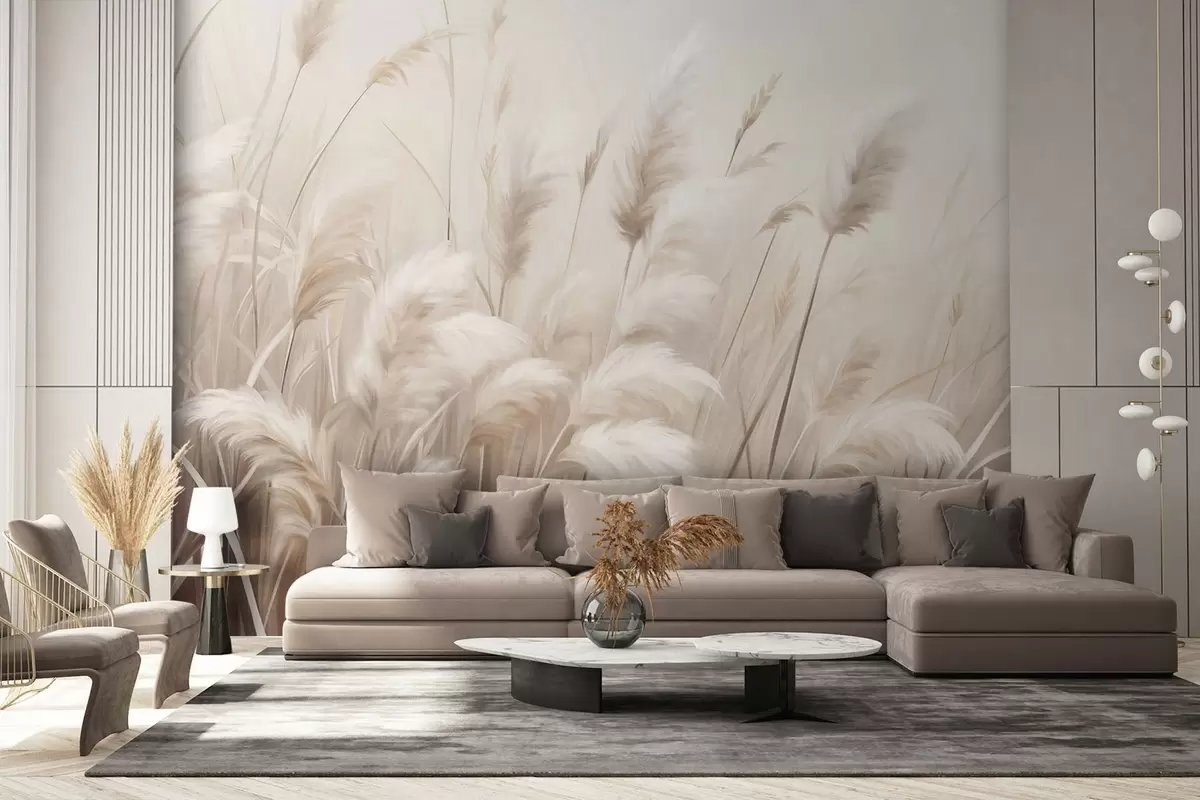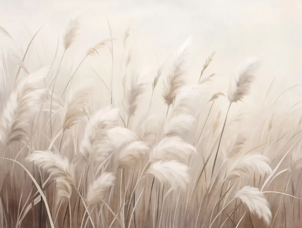Fotobehang Hoog, gestructureerd pampagras in zachte, warme, neutrale tinten, met een wazige, lichte achtergrond N° w09637