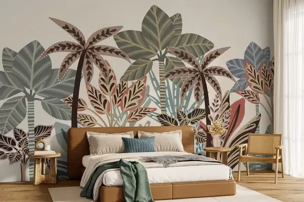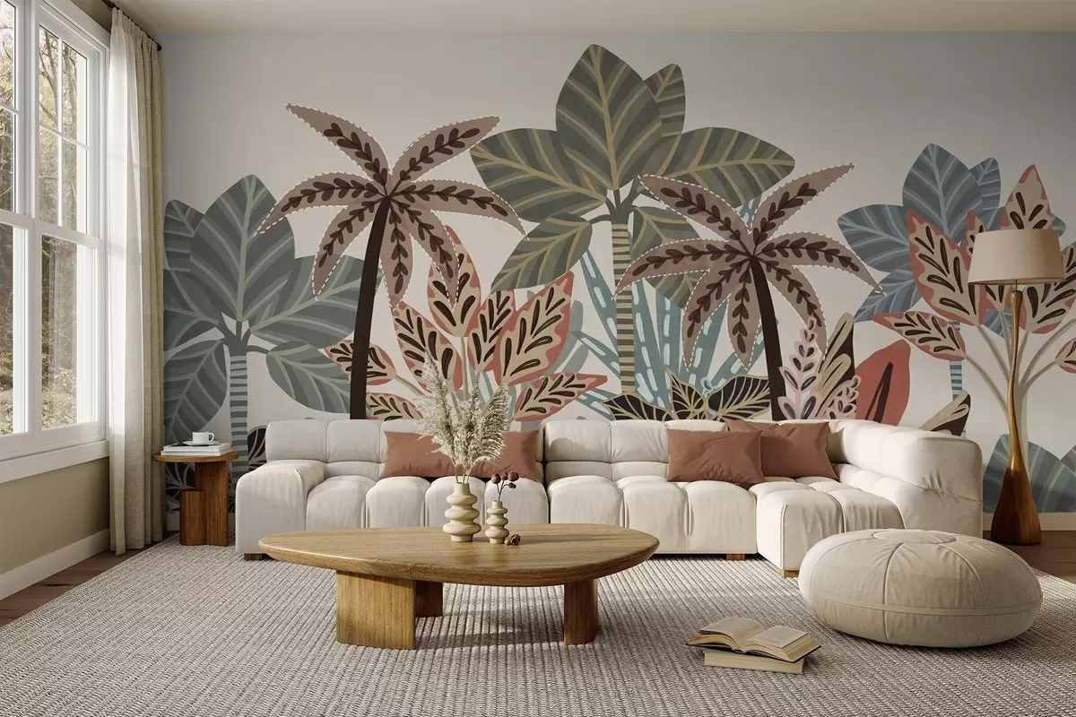 Fotobehang Getextureerde tropische planten en palmbomen met gedempte kleuren in decoratieve boho-stijl tegen een crèmekleurige achtergrond N° w09639
