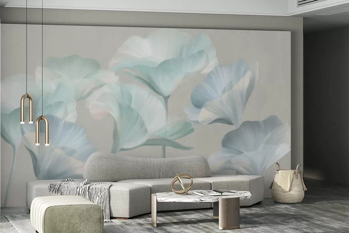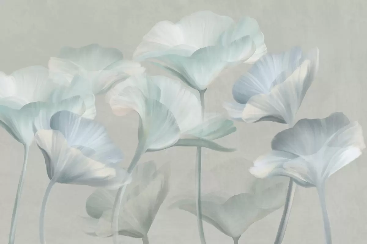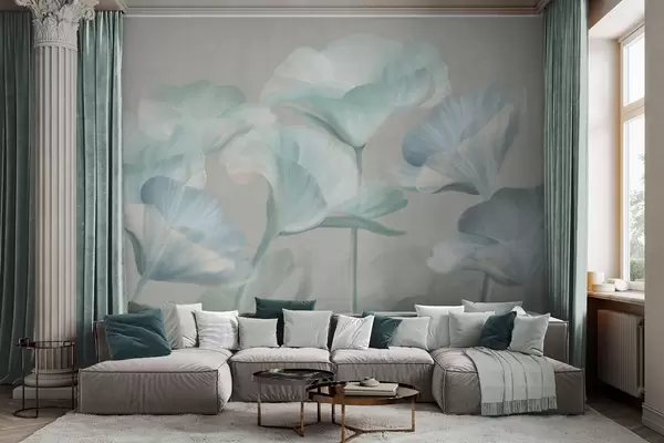 Fotobehang Lichtturquoise, doorschijnende lotusbloemen met delicate bloemblaadjes tegen een gedempte grijze achtergrond N° w09640v2