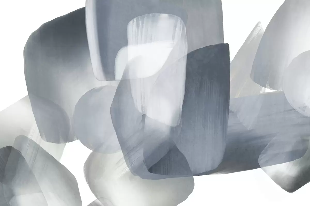 Fotobehang Abstracte vormen met textuur in gedempte blauwe en grijze kleuren, met zachte randen en overlappende lagen. N° w09642v1