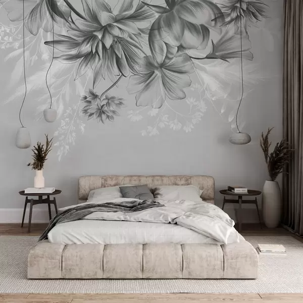 Fotobehang Getextureerde bloemen en varens in donkergrijze en witte tinten tegen een gedempte grijze achtergrond, getekend in een tekenstijl. N° w09644v1