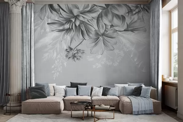 Fotobehang Getextureerde bloemen en varens in donkergrijze en witte tinten tegen een gedempte grijze achtergrond, getekend in een tekenstijl. N° w09644v1