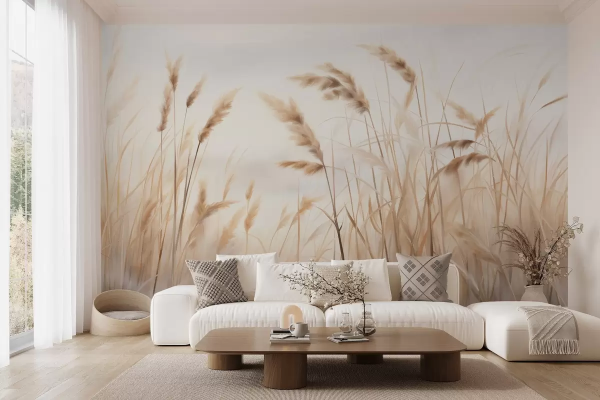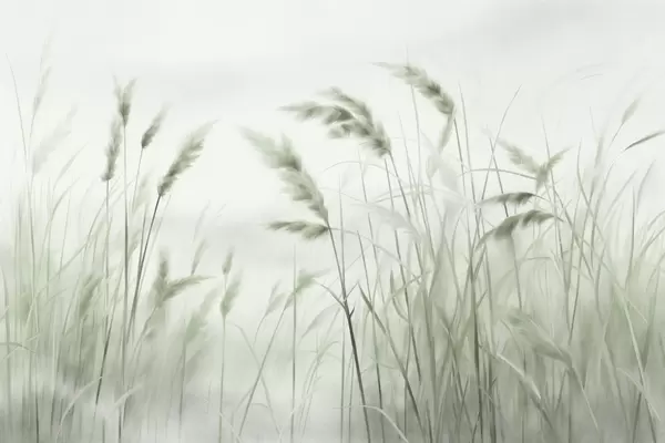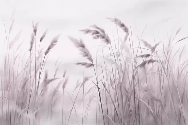 Fotobehang Hoog, gestructureerd droog gras met korenaren in het veld tegen een zachte, bleke achtergrond N° w09648