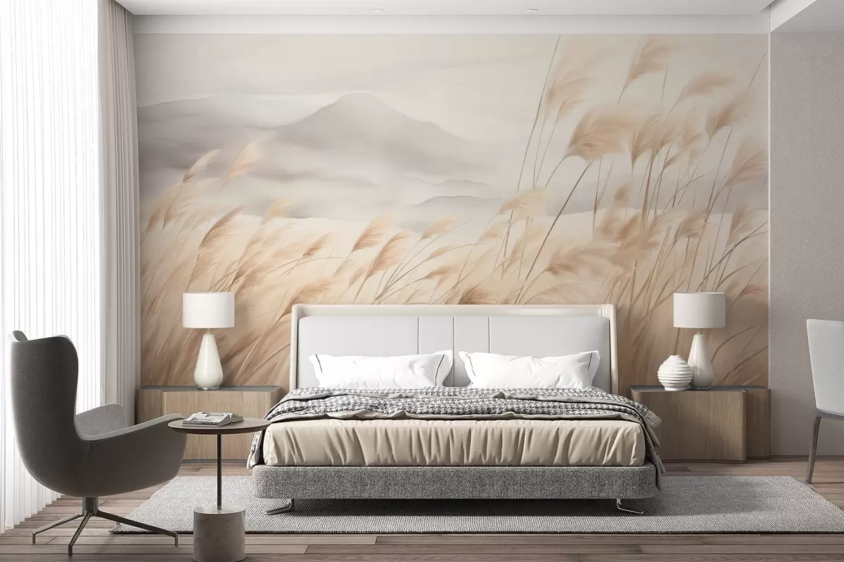 Fotobehang Getextureerd berglandschap met hoog, droog gras onder een nevelige hemel N° w09649
