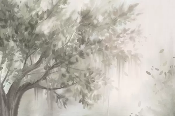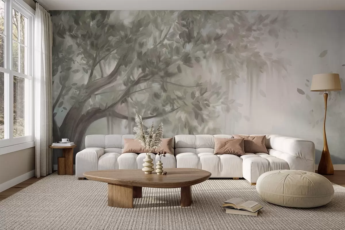 Fotobehang Getextureerde boom met lichtgroene bladeren en takken, met een zachte, wazige achtergrond N° w09650