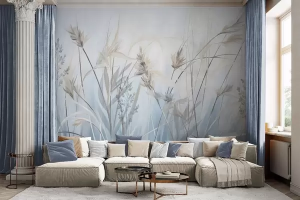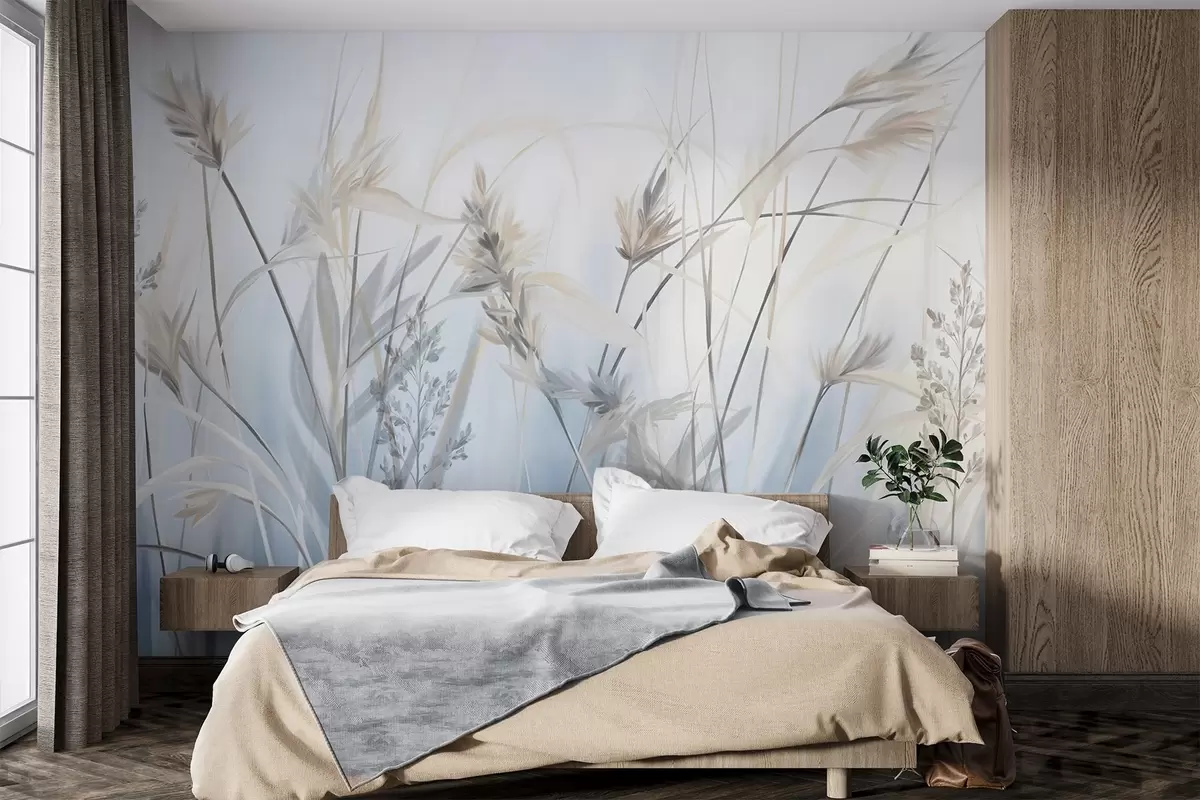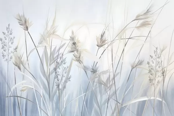 Fotobehang Hoge, droge grassprieten met pluizige toppen in gedempte tinten, zachte, wazige blauwe en witte achtergrond N° w09652