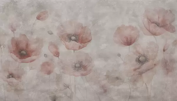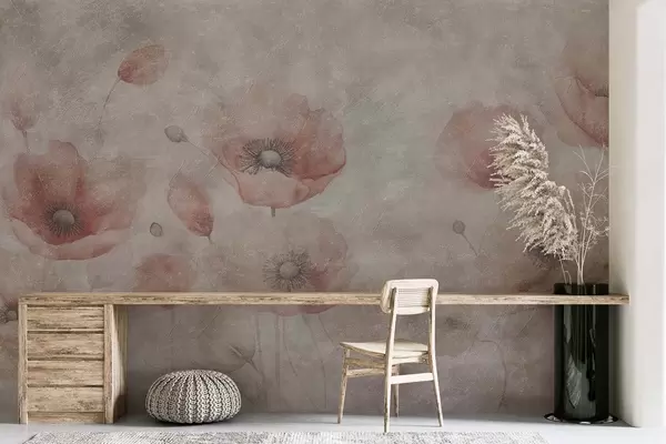 Fotobehang Grote papaverbloemen op een muur met een antiek effect N° w09686