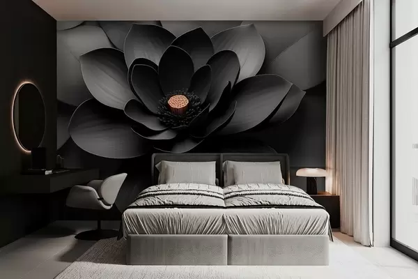Fotobehang Minimalistische zwarte bloem met bloemblaadjes en een contrasterend warm hart N° w09721