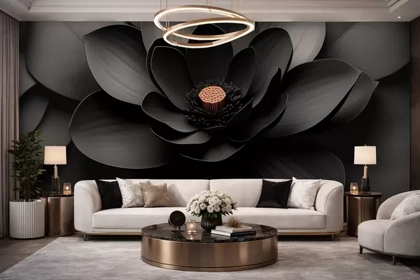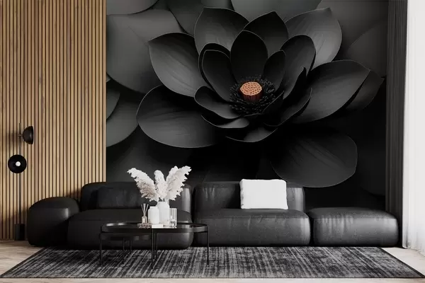 Fotobehang Minimalistische zwarte bloem met bloemblaadjes en een contrasterend warm hart N° w09721