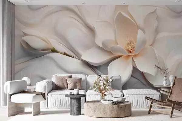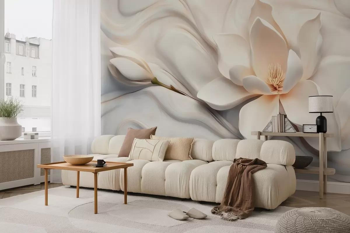 Fotobehang Driedimensionale witte magnolia met marmerstructuurimitatie in reliëf N° w09729