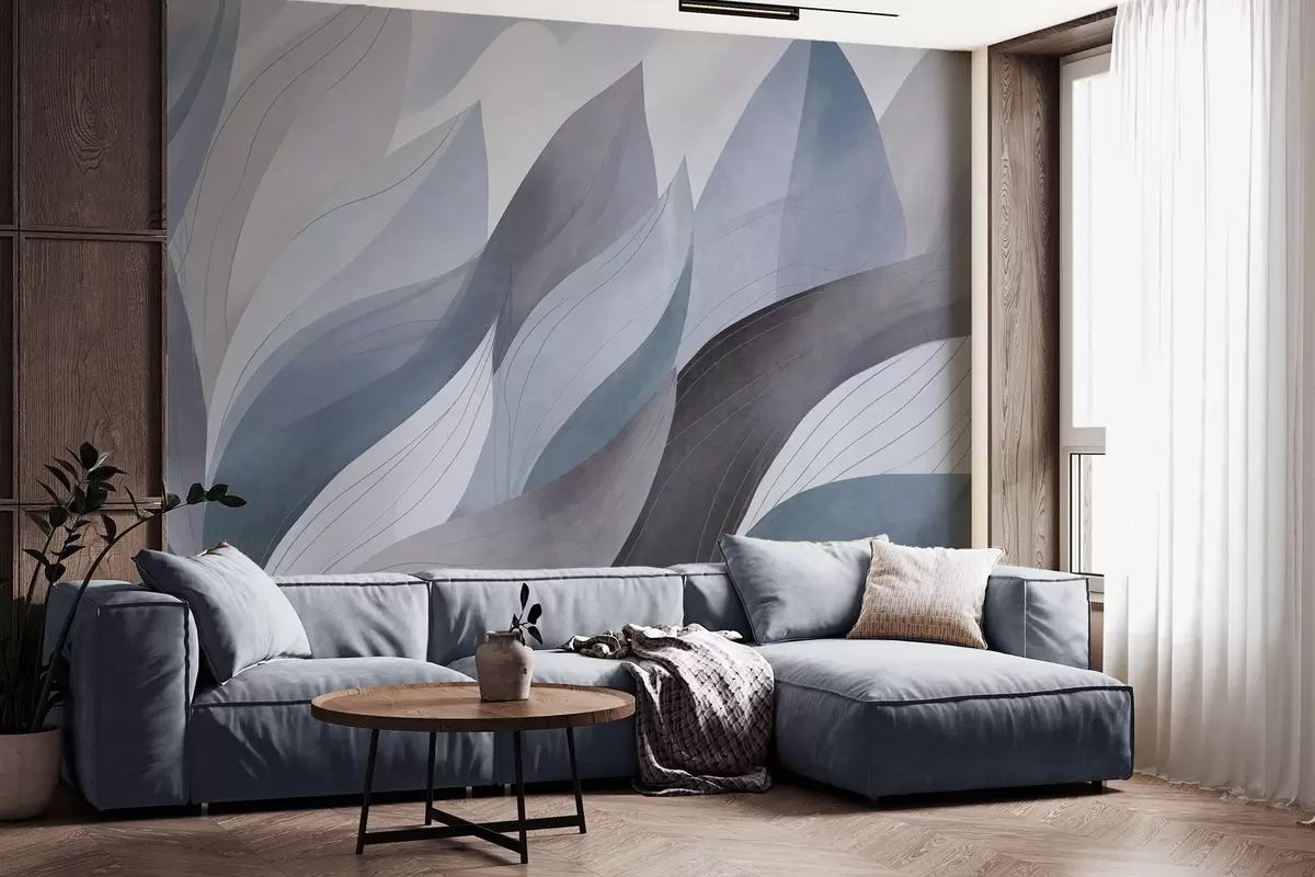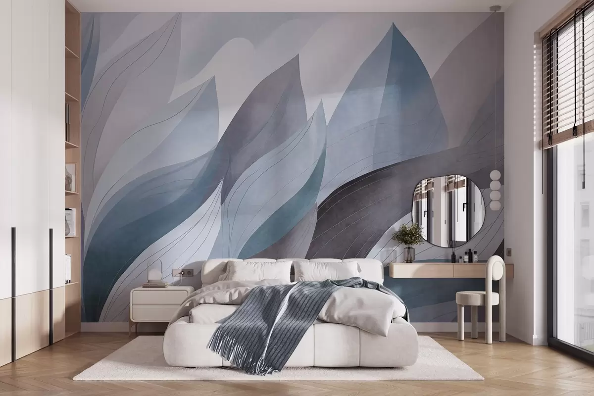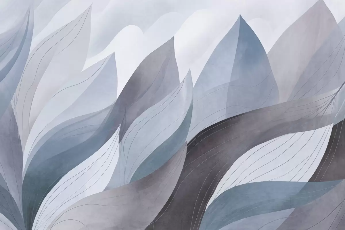 Fotobehang Abstracte bladeren, gedempte aardetinten van blauw met delicate lijndetails, zachte aquareltextuur N° w09736v1